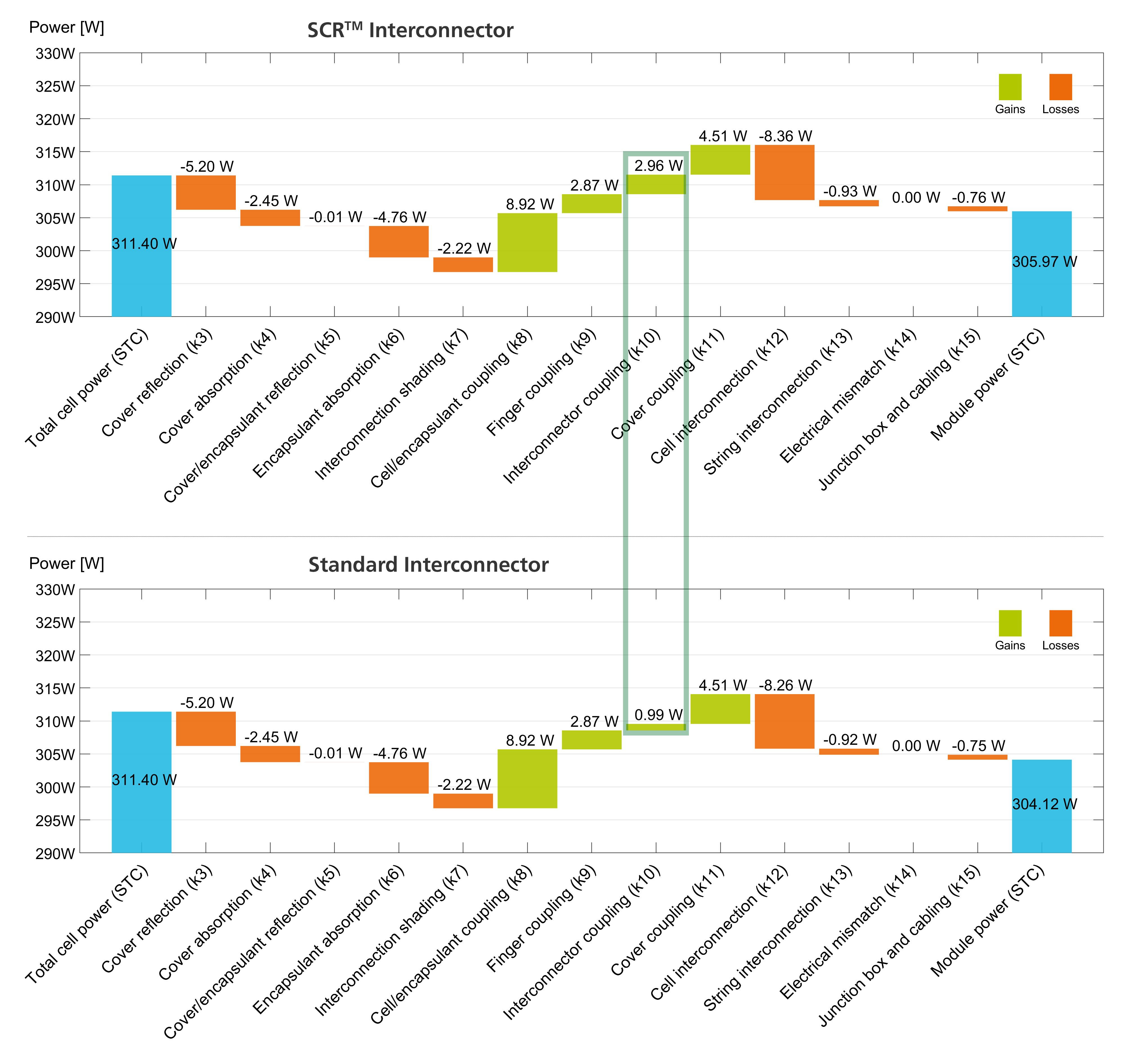 Das Software-Tool SmartCalc.CTM des Fraunhofer ISE ermöglichte die exakte Berechnung des Leistungsgewinns durch die SCRTM-Verbinder bereits im Vorfeld. Die CTM-Analyse (Cell-to-Module) ergab rechnerisch eine Leistungssteigerung von 1,85 W durch die Erhöhung der internen Reflexionsgewinne. Modulmessungen an einer Vor-Serie zeigten durchschnittlich 1,9 W Leistungssteigerung und bestätigten damit die Ergebnisse der CTM-Berechnung.