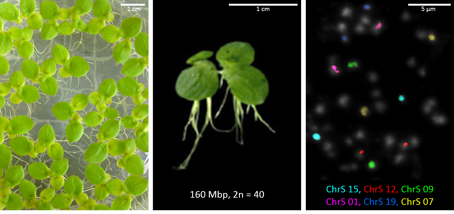 S. polyrhiza auf Nährmedium (links), Seitenansicht (mitte), und mitotische Chromosomen, von denen sechs Paare durch chromosomenspezifische Sonden markiert sind (rechts).