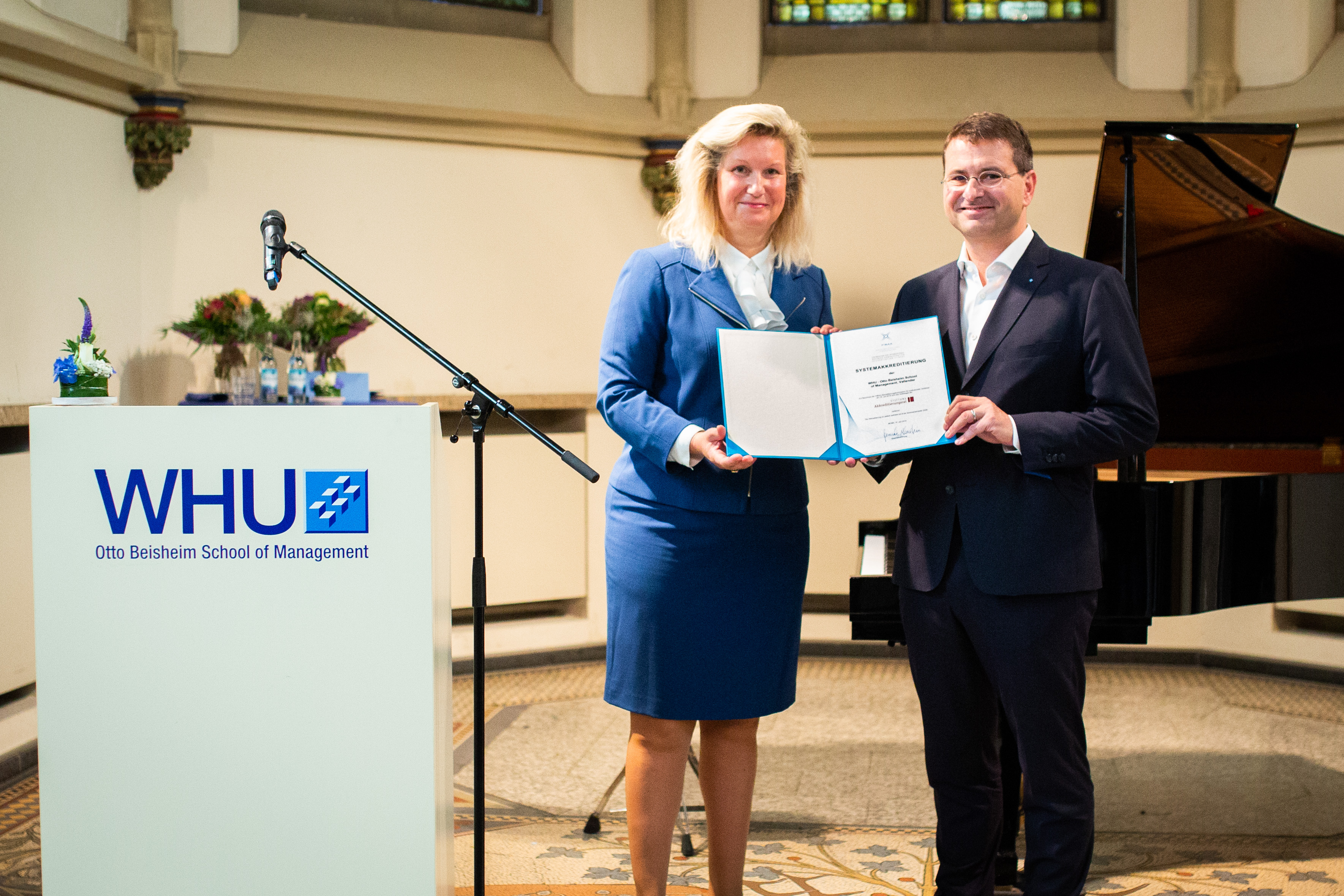 Vallendar/Düsseldorf, 25. Oktober 2018. Die WHU – Otto Beisheim School of Management hat als eine der ersten deutschen Hochschulen den Prozess der Re-Systemakkreditierung für weitere acht Jahre durchlaufen. Die Geschäftsführerin der FIBAA, Prof. Dr. Kerstin Fink, überreichte dem Rektor der WHU, Prof. Dr. Markus Rudolf, die Urkunde bei der Feierstunde in der Kapelle der Vallendarer Marienburg.