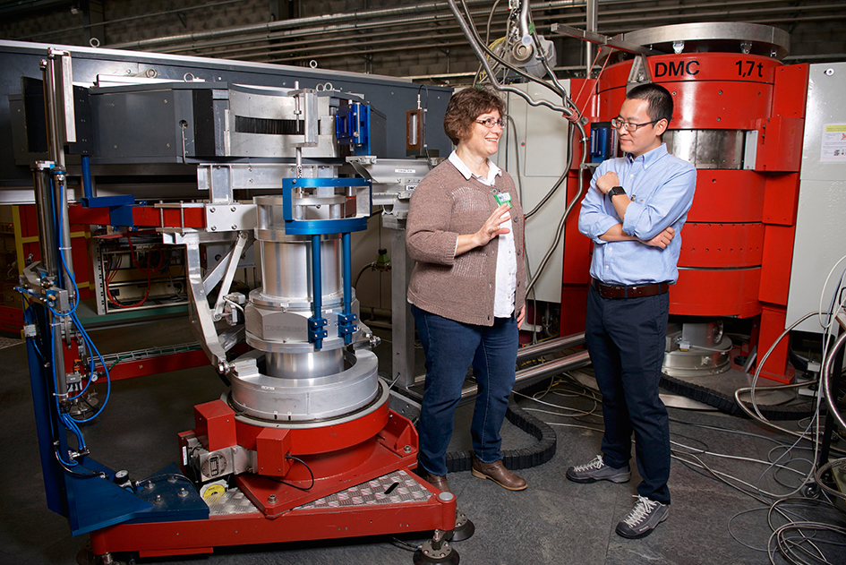 Dafür hat Shang das Material nicht nur extrem schnell abgekühlt, sondern zusätzlich zu einem Trick gegriffen, den Chemiker schon lange kennen: Er verkleinerte einfach die Abstände zwischen einigen Atomen in dem Kristallgitter, wodurch sie näher zueinander rückten. Infolge der nun kompakteren Bauweise änderten sich die elektromagnetischen Kräfte in dem Kristall derart, dass die Spiralstruktur des Kupfer-Eisen-Magneten auch bei höheren Temperaturen noch stabil blieb. Shang erreichte dies, indem er einige Bariumatome in dem Kristallgitter durch die kleineren Atome des Elements Strontium ersetzte. Das Strontium gab er bei der Herstellung des Materials im Reaktionsofen mit dazu, bevor er es schliesslich auf die bewährte Weise wieder abkühlte. Nun wollte der Physiker wissen, ob die Kombination der zwei Verfahren wirklich den gewünschten Effekt hatte. Shang untersuchte das grauschwarze Material mittels verschiedener Messmethoden, unter anderem in der Neutronenquelle SINQ, einer Grossforschungsanlage am PSI. Mithilfe spezieller Instrumente gelang es ihm, den Fingerabdruck der Magnetspiralen zu identifizieren. Besonders wichtig war für den Forscher ein Instrument mit dem komplizierten Namen Neutronendiffraktometer. Mit diesem Gerät, welches Shang sowohl an der SINQ als auch am Institut Laue-Langevin ILL in Grenoble verwendete, fand er heraus, an welchen Stellen im Kristallgitter die Atome liegen und wie weit sie jeweils voneinander entfernt sind. "Die schnelle Abkühlung des Materials zusammen mit der Abstandsänderung zwischen den Atomen hat den Effekt summiert. Der Stabilitätsbereich der Magnetspirale liegt jetzt deutlich höher als vorher", sagt Shang. Damit hat er den Temperaturbereich erreicht, den man für den Einsatz in Computern braucht. Dennoch wird es den Physikern zufolge noch eine Weile dauern, bis das Material in den Datenspeichern der Zukunft verwendet werden kann. Hierfür muss es auch in Dünnschichtfilmen funktionieren, wo viel weniger Materialmenge benutzt wird. Medarde und Shang arbeiten bereits daran. Und sie versuchen, den Perowskitkristall noch weiter zusammenzuquetschen, indem sie noch kleinere Atome als Strontium einbauen. Wenn ihnen beides gelingt, stehen die Chancen gut, dass das multiferroische Material einmal die Grundlage sein wird, um die Speichertechnologie zu revolutionieren.