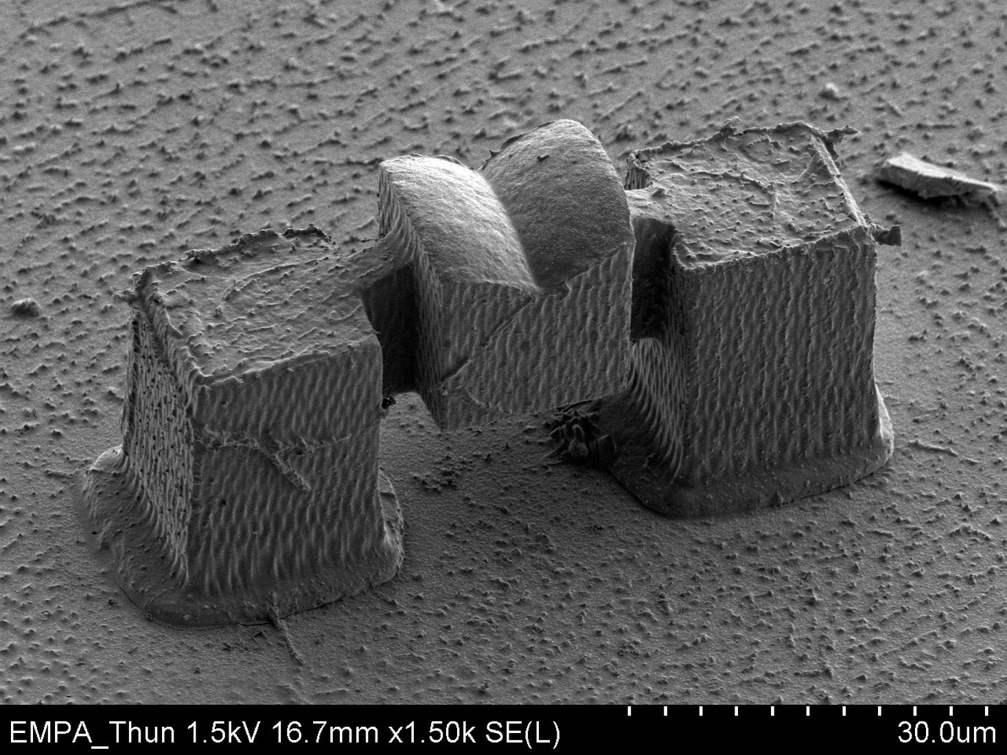 Doch für die Forscher der Empa ist diese Art Prototypenfertigung nur ein Nebenaspekt ihrer wissenschaftlichen Arbeit. «Unser Ziel ist keineswegs, mit Zulieferern der Uhrenindustrie in Konkurrenz zu treten», sagt Johann Michler. «Uns an der Empa interessiert vor allem der Prozess der Miniaturisierung an sich.» Mit winzig kleinen Stempeln und Nadeln untersucht Michlers Team die mechanischen Eigenschaften der extrem kleinen Bauteile. Denn: Die Eigenschaften von Materialien ändern sich, wenn man Mechanik miniaturisiert: Duktile Metalle werden härter; spröde Keramik wird dagegen teilweise duktil bei sehr kleinen Bauteilabmessungen.