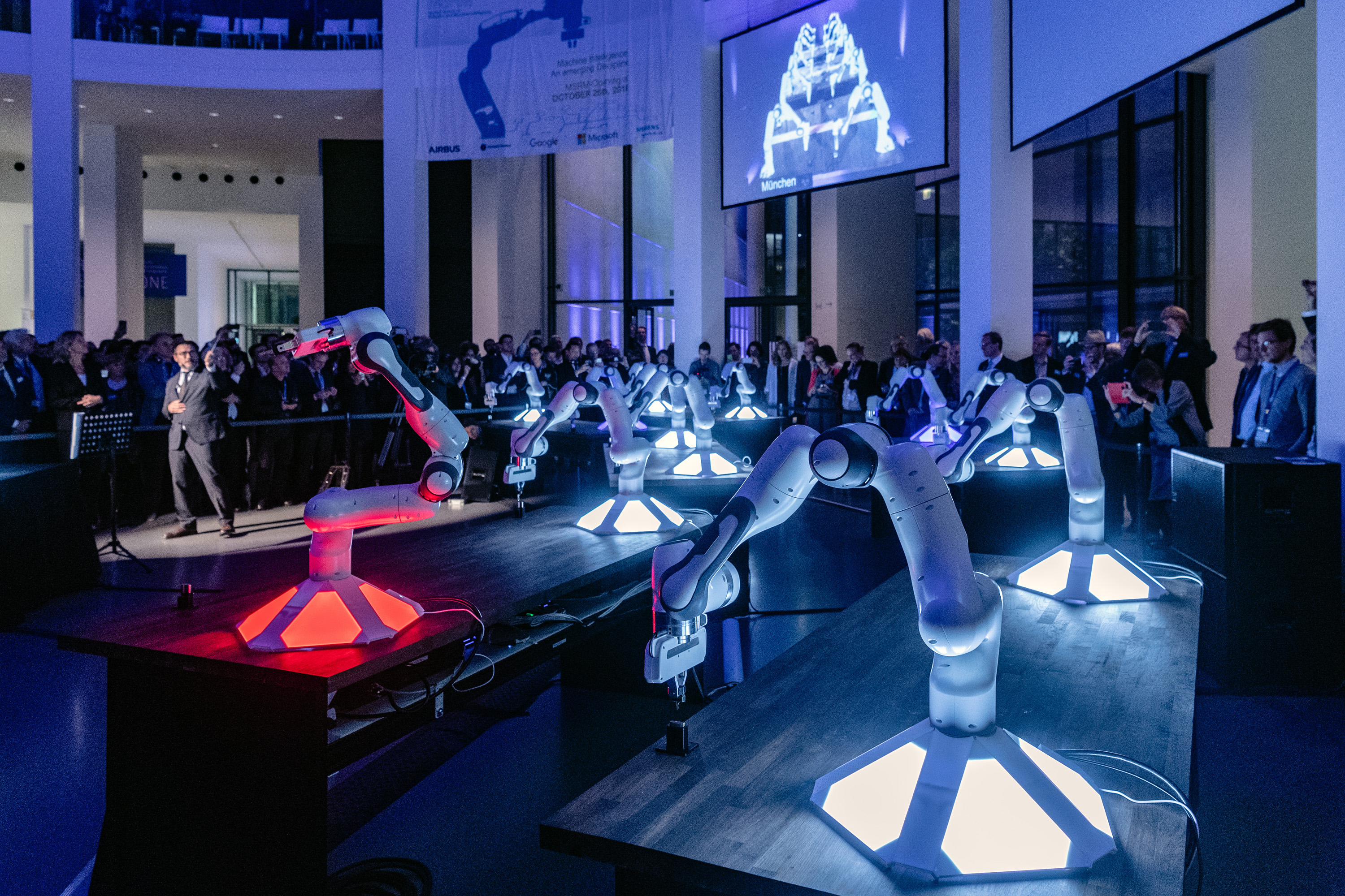 Höhepunkt des Abends war eine weltweit erstmals gezeigte städteübergreifende Demonstration zur Verbindung von Robotik und vernetztem maschinellem Lernen. In einem „Roboter-Klassenzimmer“ im Foyer der Pinakothek sollen zwölf Roboterarme lernen, verschiedene Schlüssel in Schlösser zu stecken und diese zu öffnen. Die Lösung: neuartige Lernalgorithmen und Vernetzung über eine superschnelle von Vodafone zur Verfügung gestellte Mobilfunkverbindung. So wurden die Roboter zu einem Team, das individuelle Lernerfolge verzögerungsfrei teilen konnte. Nicht nur in der Pinakothek: Weitere „Klassenzimmer“ im Gebäude der MSRM und im Düsseldorfer 5G-Lab von Vodafone waren über das Mobilfunknetz mit den Robotern verbunden und über Videoleinwände zugeschaltet. Gemeinsam hatten sie das Problem für mehr als 30 unterschiedliche Schlüssel innerhalb weniger Minuten gelöst.