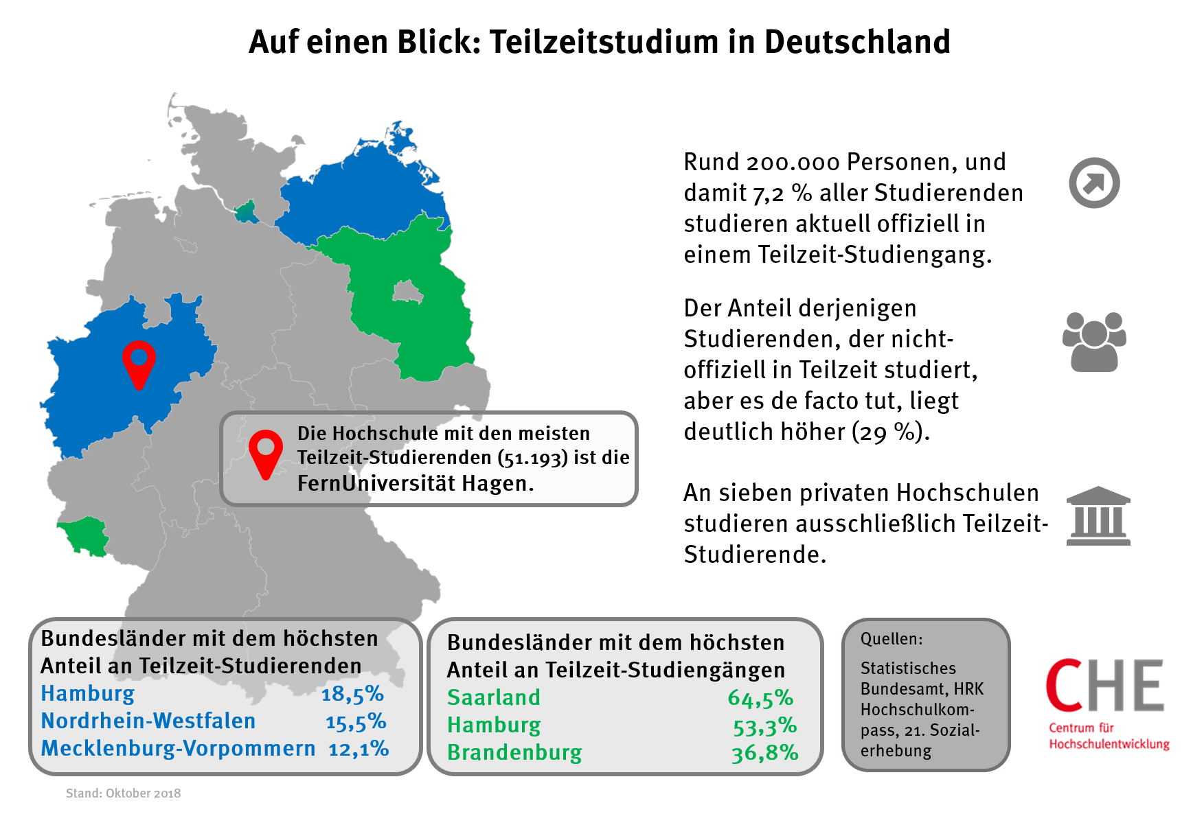 Im Ländervergleich verzeichnet Hamburg die höchste Quote an Teilzeitstudierenden. Im Stadtstaat studiert rund jeder fünfte Studierende nicht in Vollzeit. Das liegt u.a. an zwei dort beheimateten privaten Fern-Hochschulen, deren rund 17.000 Studierende überwiegend ein Teilzeitstudium absolvieren. Die geringste Quote weist das Saarland mit einem Anteil von 0,4 Prozent auf.