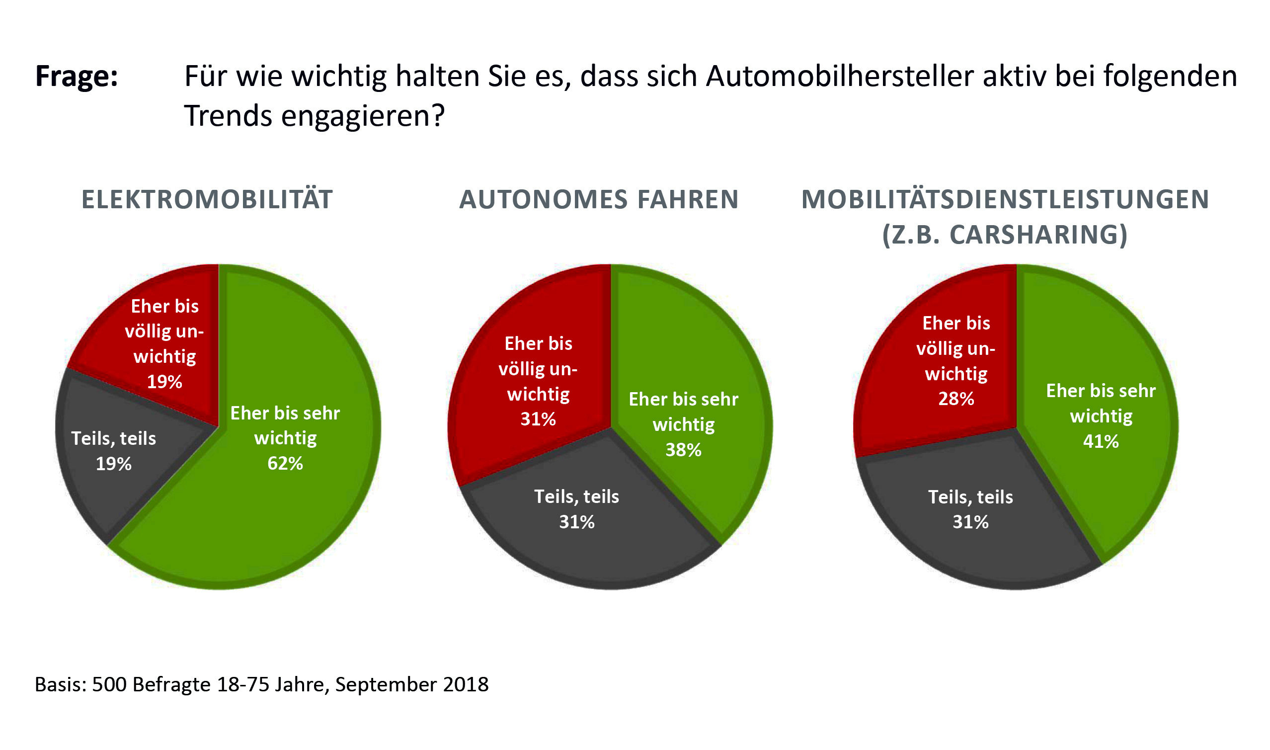 „Die Menschen können sich langsam, aber nachhaltig mit autonomem Fahren anfreunden“, lautet ein Fazit, das Prof. Dr. Udo Klaiber aus der Studie zieht. 38% gaben an, dass sie es für „eher bis sehr wichtig“ halten, dass die Automobilhersteller sich mit autonomem Fahren beschäftigen. Hier hat die Elektromobilität mit 62% klar die Nase vorn, bei Mobilitätsdienstleistungen wie Carsharing liegt der Wert bei 41%.