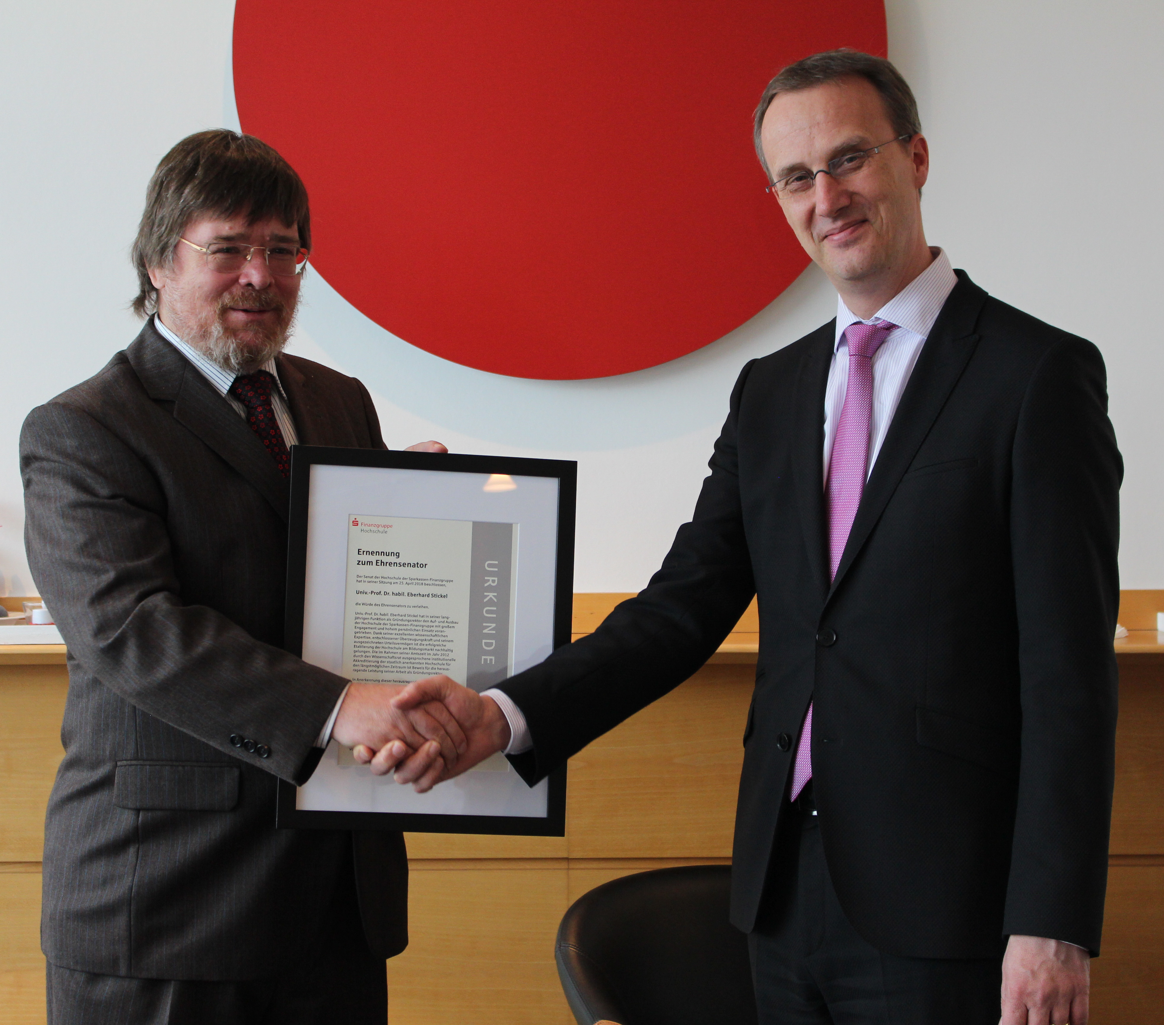 Der Senat der Hochschule der Sparkassen-Finanzgruppe hat den ehemaligen Gründungsrektor, Univ.-Prof. Dr. habil. Eberhard Stickel, in Anerkennung seiner herausragenden Verdienste um den Aufbau und die Etablierung der staatlich anerkannten Hochschule zum Ehrensenator ernannt.