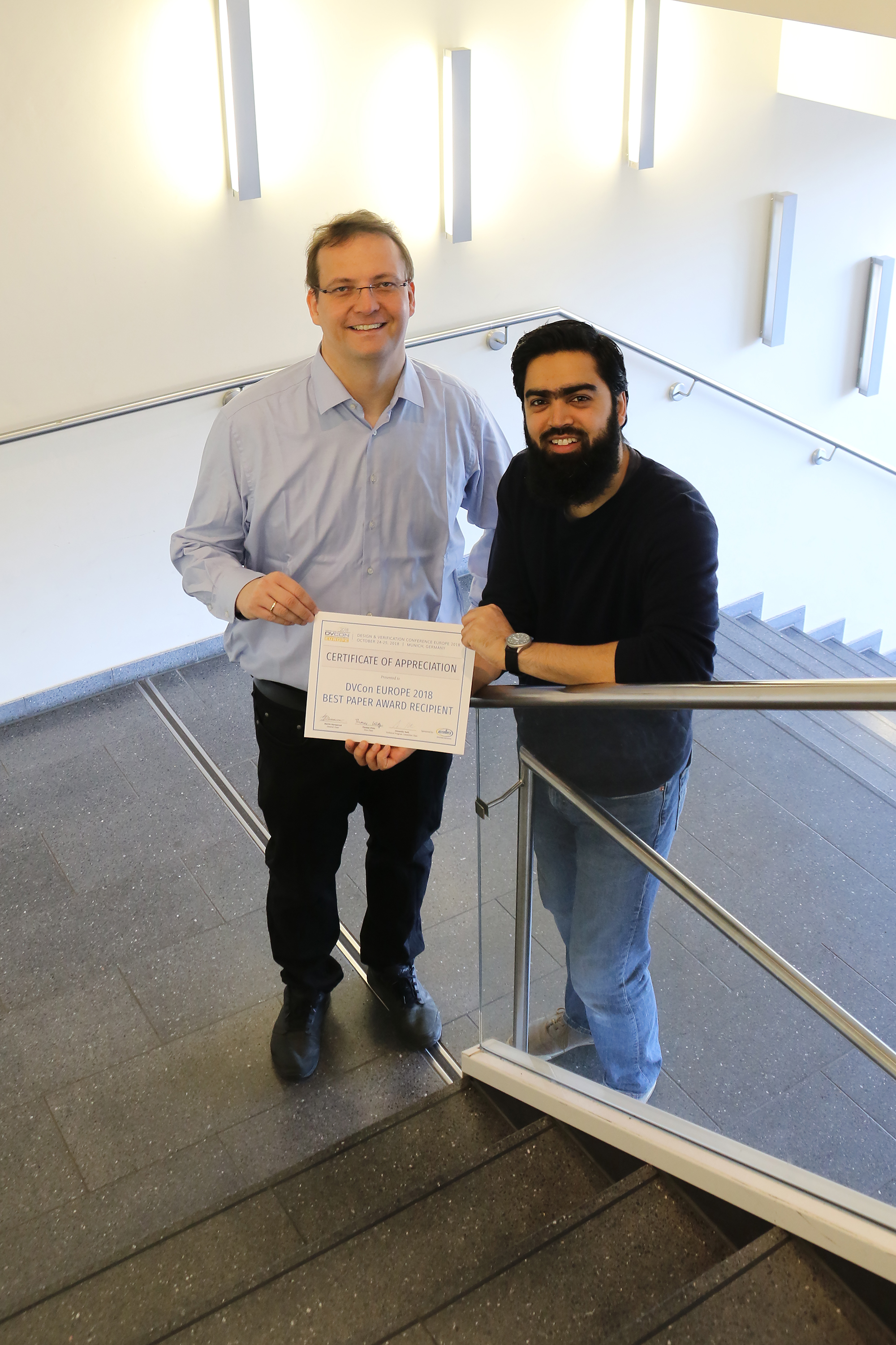 Elektronische Systeme werden immer komplexer und bestehen meist aus digitalen und analogen Komponenten. Der Aufwand für die Verifikation solcher Systeme ist jedoch kaum zu beherrschen. In Ihrer Publikation „Using Constraints for SystemC AMS Design and Verification“ ist es Dr. Daniel Große und Muhammad Hassan vom Forschungsbereich Cyber-Physical Systems des Deutschen Forschungszentrums für Künstliche Intelligenz (DFKI GmbH) in Zusammenarbeit mit Thilo Vörtler und Karsten Einwich von der COSEDA Technologies GmbH gelungen, einen Lösungsansatz für dieses Problem aufzuzeigen. Dafür wurden sie jetzt auf der „DVCon Europe 2018“ in München mit dem „Best Paper Award“ ausgezeichnet.