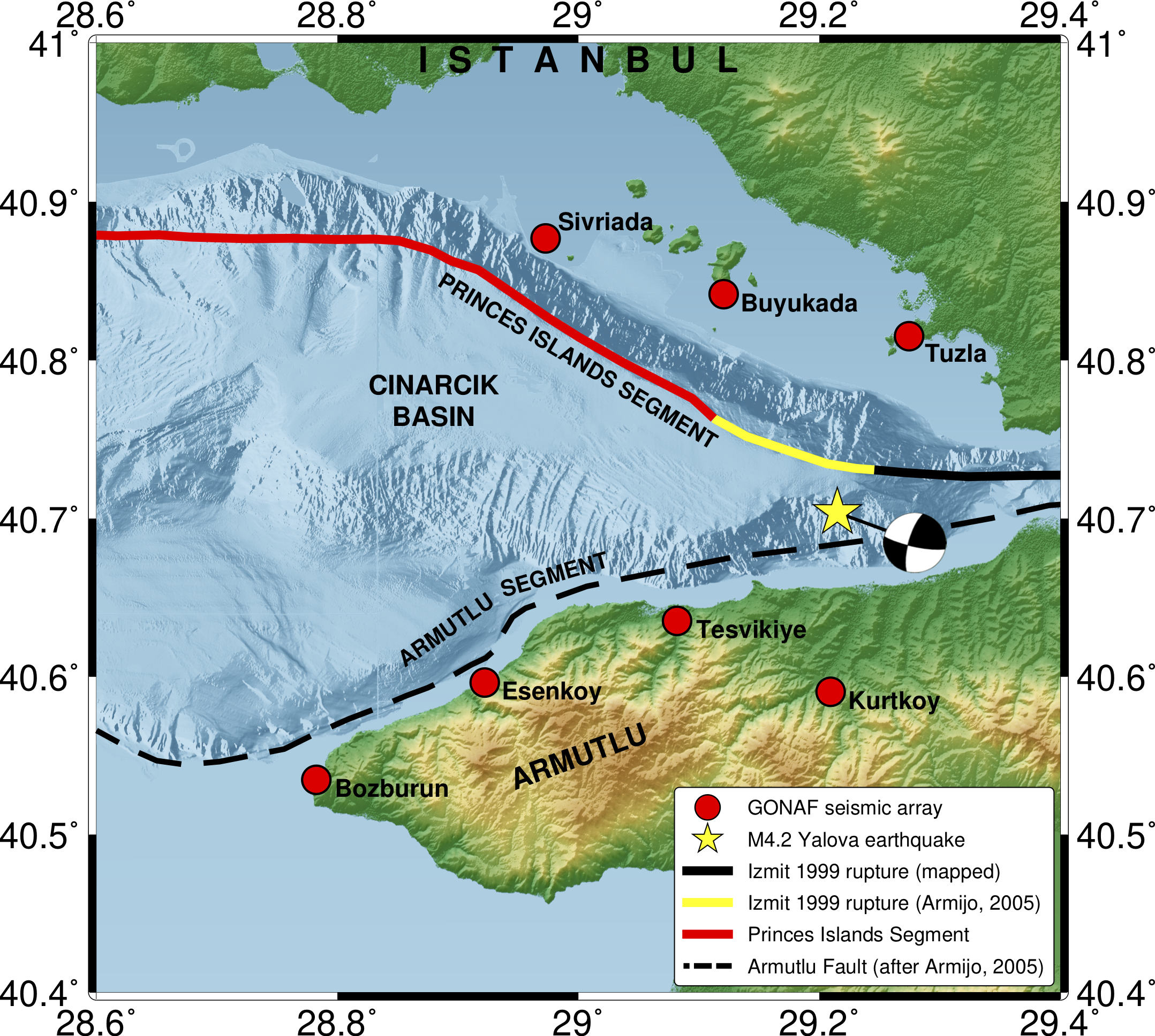 Die Studie von Malin, Bohnhoff und Kollegen des türkischen Katastrophenschutzes AFAD nutzt Wellenformendaten aus dem kürzlich errichteten Bohrlochobservatorium GONAF. GONAF überwacht die Erdbebenzone vor Istanbul und detektiert auch Erdbeben von geringer Magnitude. So zeichnete es eine Reihe von Mikrobeben auf, die vor einem Erdbeben der Stärke 4,2 im Juni 2016 südlich von Istanbul stattfanden. Das 4,2-er Beben war das größte lokale seismische Ereignis seit Jahren, denn dort sind die Erdplatten verhakt und bauen so seit 1766 – dem letzten Starkbeben dort – kontinuierlich Spannung auf.