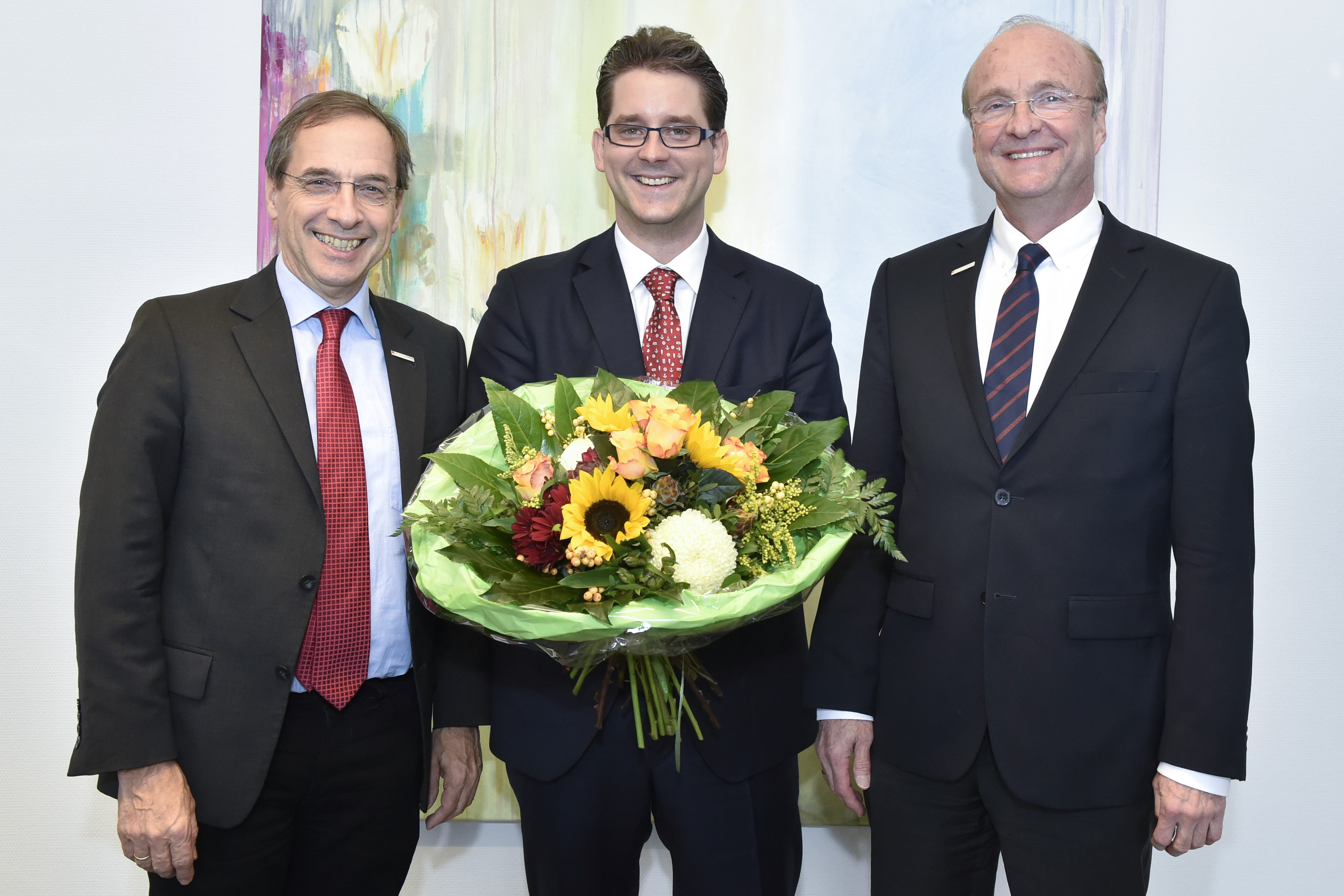 Bildunterzeile: Der Vorstandsvorsitzende und Medizinische Vorstand der Universitätsmedizin Mainz Univ.-Prof. Dr. Norbert Pfeiffer (l.) und der Wissenschaftliche Vorstand der Universitätsmedizin Mainz Univ.-Prof. Dr. Ulrich Förstermann (r.) begrüßen Univ.-Prof. Dr. Dr. Michael Schmeißer (Bildmitte) an der Universitätsmedizin Mainz.