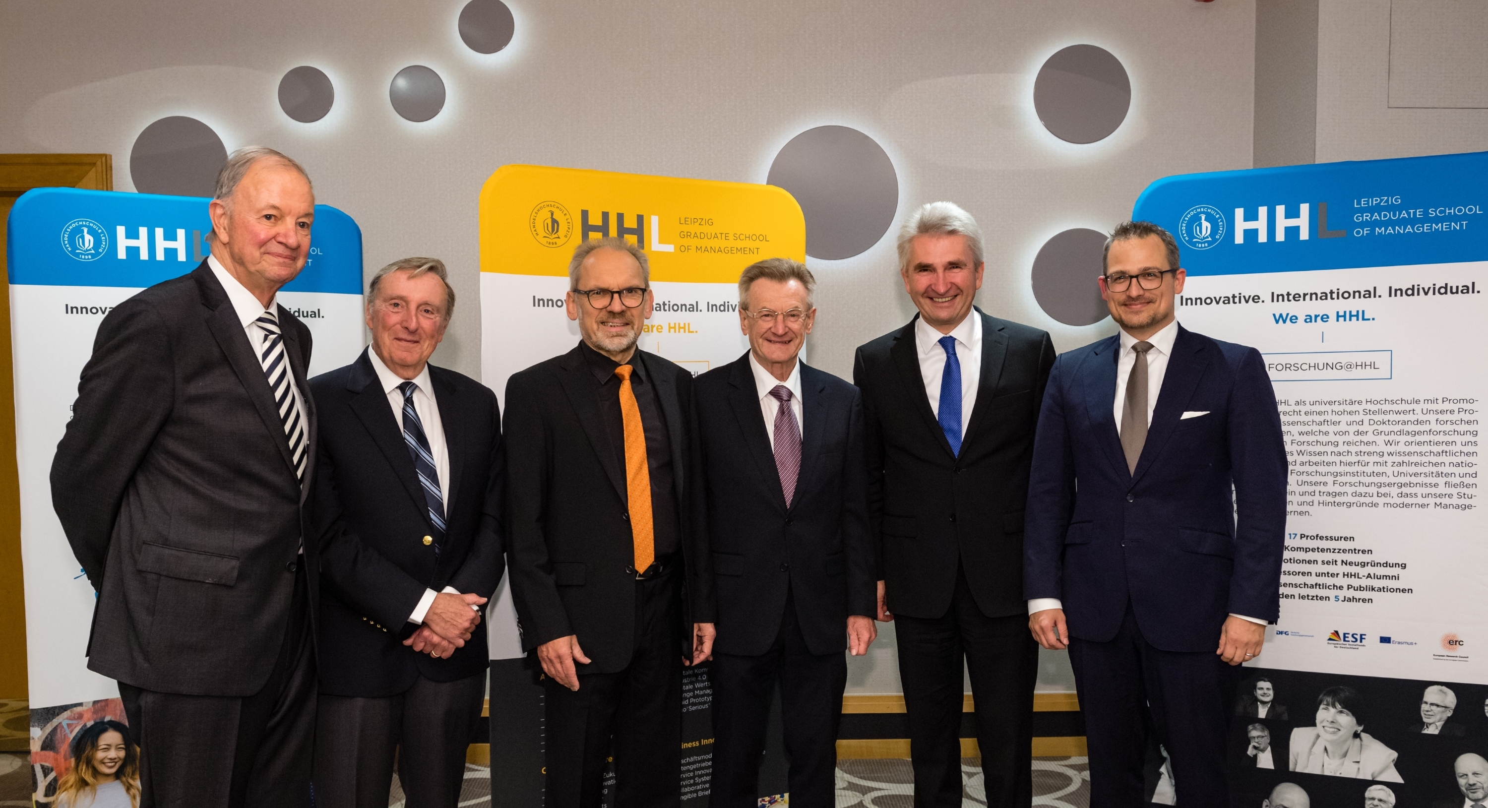 Der aktuelle Rektor der HHL Leipzig Graduate School of Management, Prof. Dr. Stephan Stubner (re), konnte das 120jährige Gründungsjubiläum mit gleich fünf Amtsvorgängern zusammen feiern.