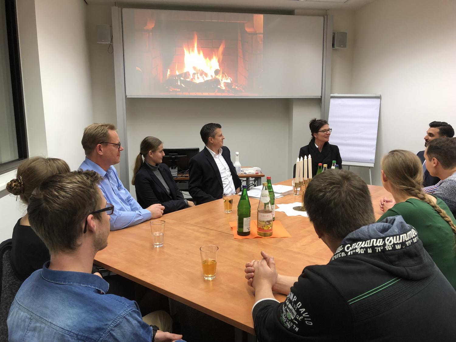 Am 25. Oktober 2018 fand im Studienzentrum Holstenhofweg der NBS Northern Business School in Hamburg das Karriere-Veranstaltungsformat "Kaminabend" im Studiengang "Betriebswirtschaft (B.A.)" statt. Hierzu laden Professoren des jeweiligen Fachgebiets, in diesem Fall Prof. Dr. Harriet Kleiminger (Professur Personalmanagement), Praxisvertreter unterschiedlicher Branchen ein, die den Studierenden ihren Werdegang sowie berufliche Perspektiven im jeweiligen Unternehmen vorstellen. Dieses Mal zu Gast: drei Mitarbeiter der Hamburger Sparkasse aus den Bereichen "Firmenkundenberatung" und "Private Banking".