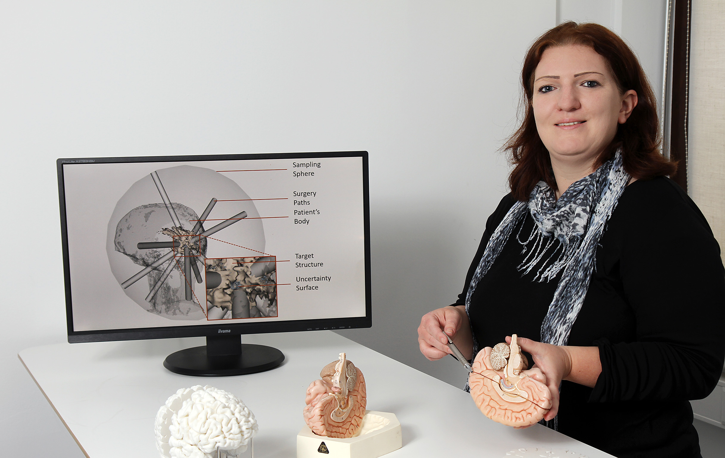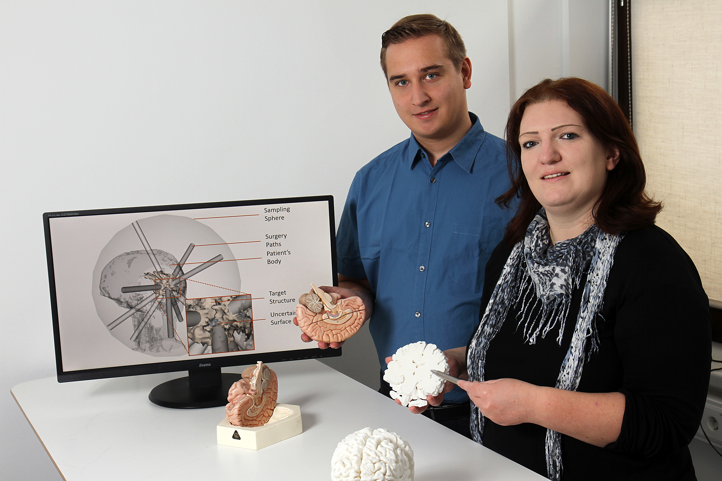 Um beispielsweise einen Tumor im Gehirn zu entfernen, setzen viele Chirurgen heute auf Schlüsselloch-Operationen: Ein kleines Loch in der Schädeldecke reicht, damit sie mit einer kleinen Sonde an die betroffene Stelle gelangen. Ausgestattet ist die Sonde mit Operationsbesteck und einer Kamera, die den Medizinern die notwendigen Bilder liefert. „Eine solcher Eingriff muss zuvor gründlich geplant werden“, sagt Dr. Christina Gillmann von der Technischen Universität Kaiserslautern (TUK). „Die Chirurgen müssen den idealen Weg, also den Operationskanal, zum betroffenen Ort finden, der möglichst wenig wichtiges Gewebe im Gehirn schädigt.“
