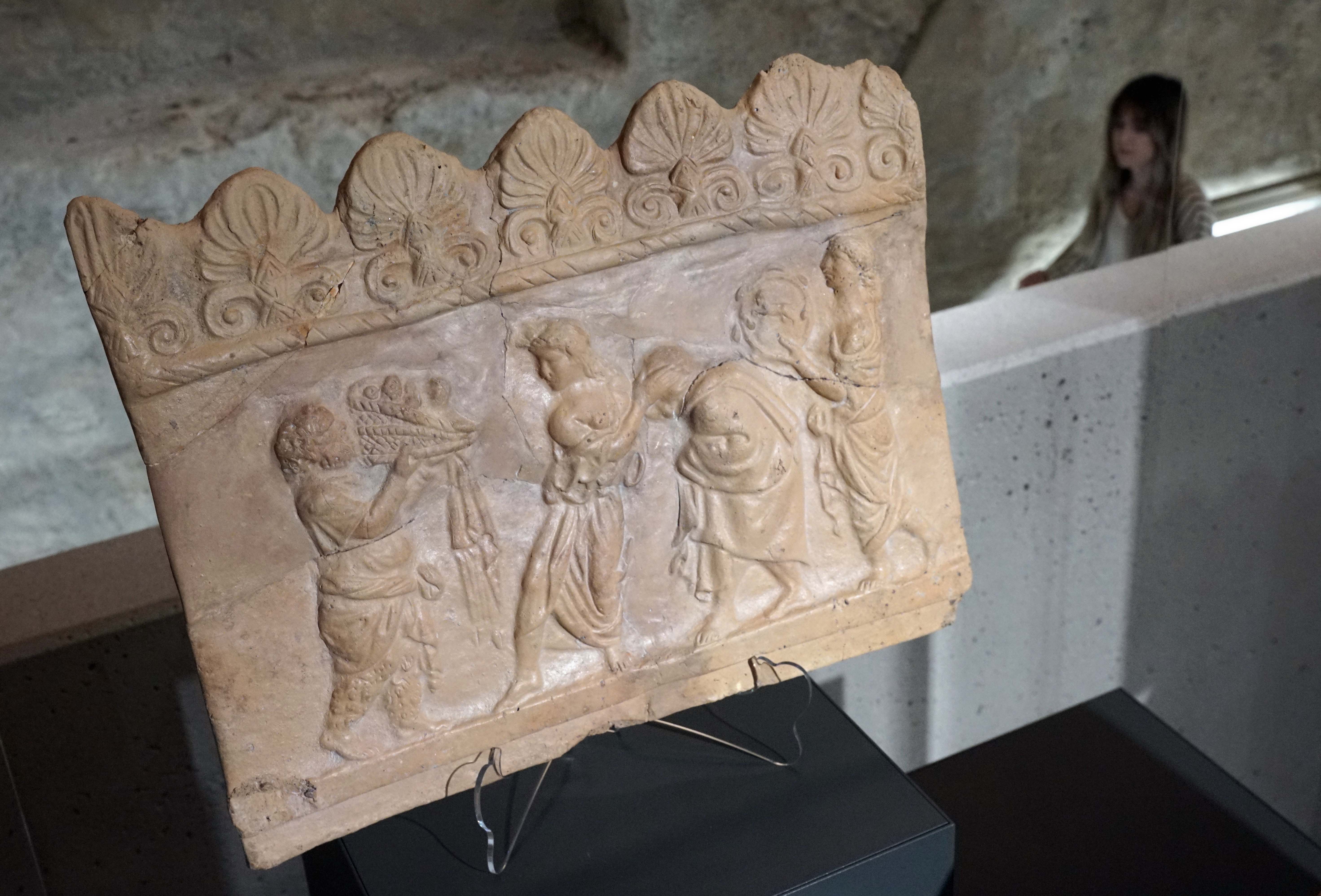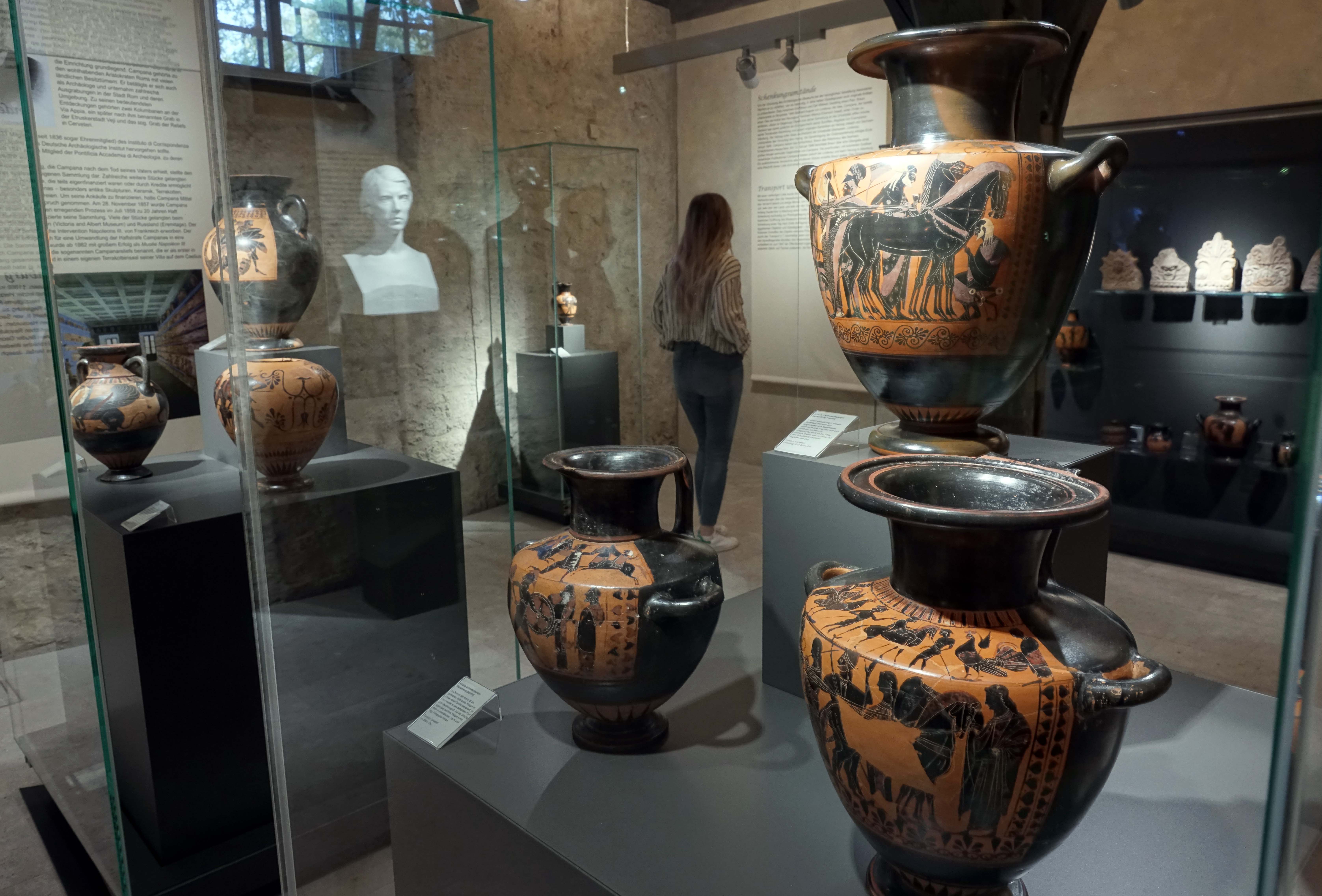 Zu den herausragenden Exponaten gehört ein sogenanntes „Campana-Relief“. „Dabei handelt es sich um eine architektonische Schmuckplatte aus Ton, die von der Mitte des ersten Jahrhunderts vor bis ins zweite Jahrhundert nach Christus hergestellt wurden und nach Campana benannt sind, denn er war der Erste, der sie sammelte und darüber publizierte“, sagt Dr. Graen. Die Platten brachte man an hölzernen Dachbalken an, um diese vor der Verwitterung zu schützen. Die ausgestellte Campana-Platte ist mit einer Szene aus dem Mysterienkult des Gottes Dionysos verziert.