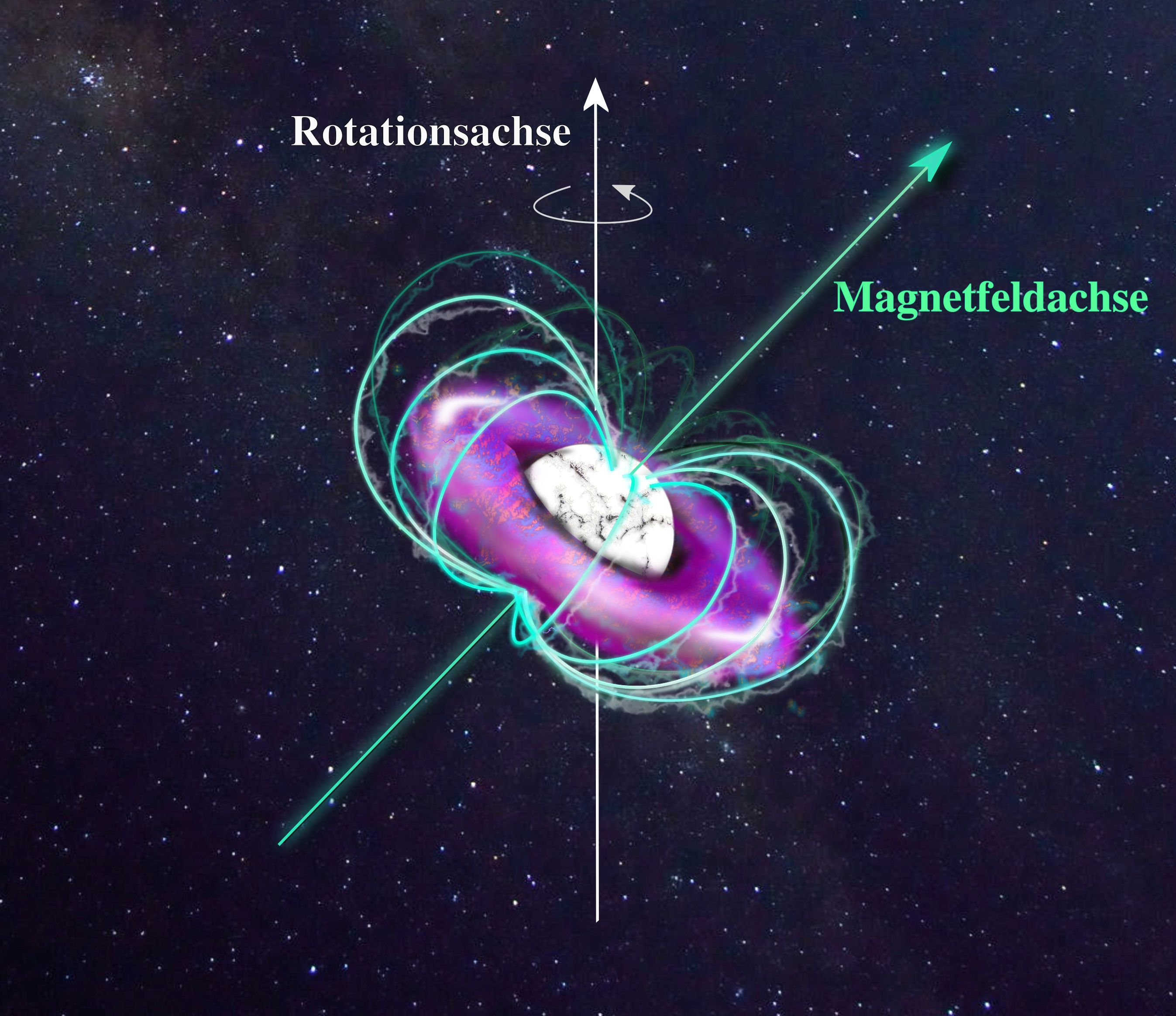 Aus ihren Beobachtungen konnten die Forscher schließen, dass der Stern von einem Magnetfeld umgeben ist. Diese fängt gasförmiges Material ab, das von seiner Oberfläche abströmt. Schockwellen innerhalb dieser sogenannten Magnetosphäre heizen das Material drastisch auf und streifen somit fast alle Elektronen von den Metallatomen ab. „Man kann sich die Gashülle als eine Art Donut aus ultra-heißem Material vorstellen, der den sowieso schon heißen Stern umgibt”, erklärt Nicole Reindl. Die Achse des Magnetfelds sei dabei relativ zur Rotationsachse des Sterns verkippt. „Das heißt, dass die Menge des schock-geheizten Materials, das wir sehen, sich mit der Drehung des Sterns verändert.”