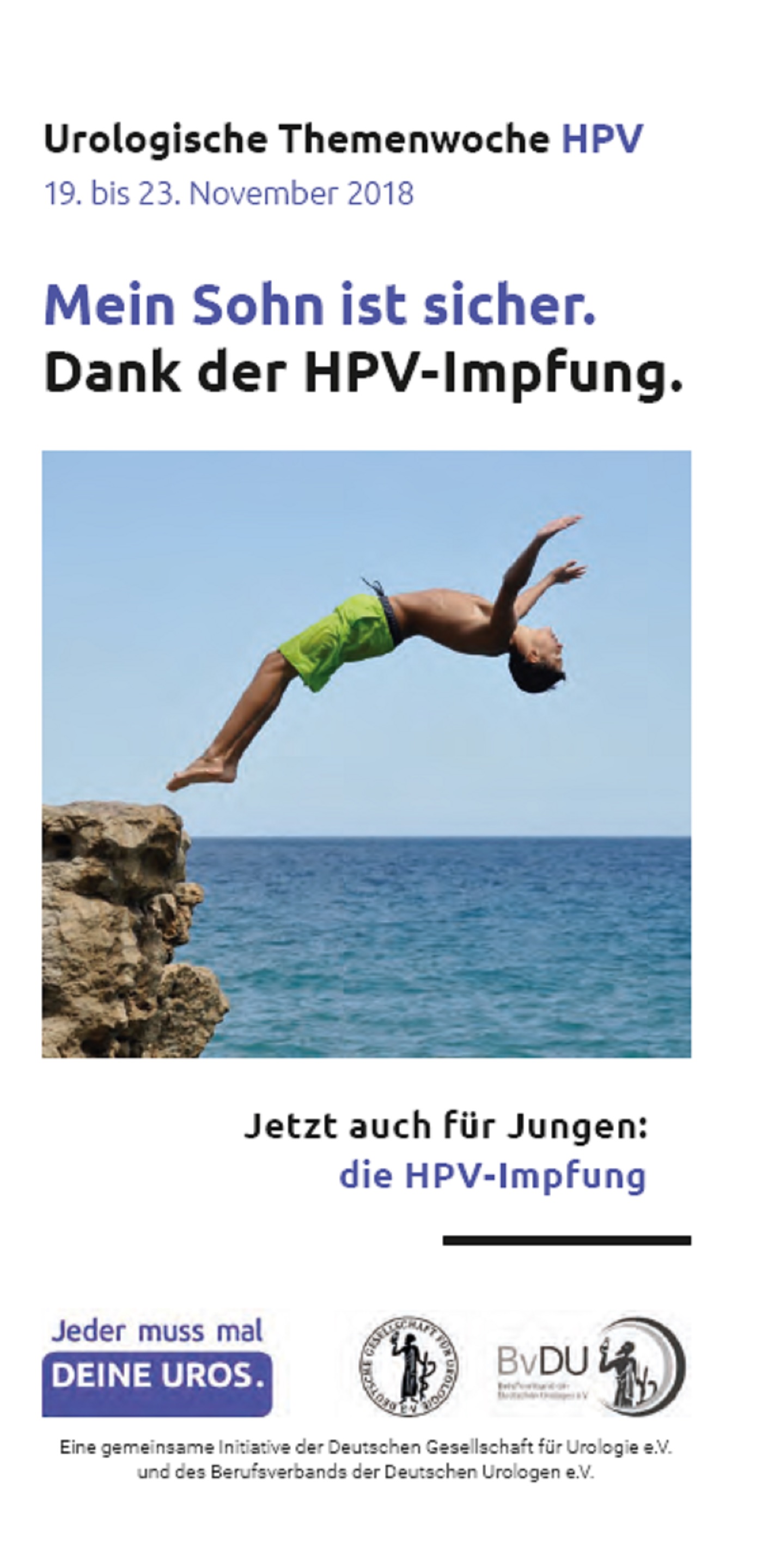 Seit Juni 2018 gilt die bisherige HPV-Impfempfehlung der Ständigen Impfkommission (STIKO) am Robert Koch-Institut für Mädchen aus dem Jahr 2007 auch für Jungen von 9 bis 17 Jahren. Die Impfung gegen Humane Papillomviren (HPV) schützt beide Geschlechter vor Anogenitalwarzen und HPV-bedingten Krebserkrankungen und wird künftig auch für Jungen von den gesetzlichen Krankenkassen bezahlt. Flyer und Poster zur Themenwoche können Ärzte, Apotheken, öffentliche Institutionen und Verbände zur Unterstützung der multimedialen Kampagne kostenfrei auf der Homepage von DGU und BvDU bestellen.