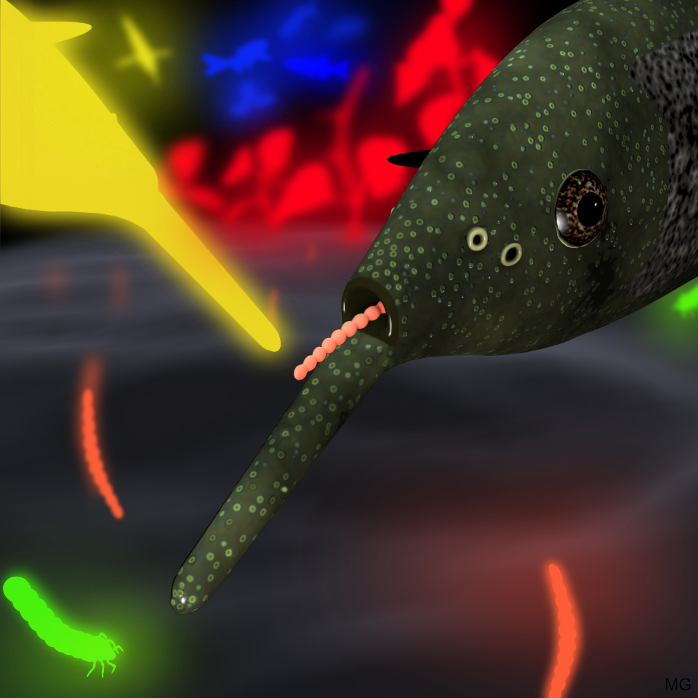 Elefantenrüsselfische sind nachtaktiv. Auf ihre Augen können sie sich daher bei der Beutesuche nicht verlassen. Das haben sie aber auch gar nicht nötig: In ihrem Schwanz tragen sie eine Art „Elektro-Taschenlampe“ mit sich. Damit erzeugen sie rund 80 Mal pro Sekunde kurze elektrische Pulse. Ihre Haut wiederum – insbesondere ihr rüsselartiges Kinn – ist übersät von Elektrorezeptoren: kleinen Messfühlern, mit denen sie messen können, wie diese Pulse von der Umgebung reflektiert werden.