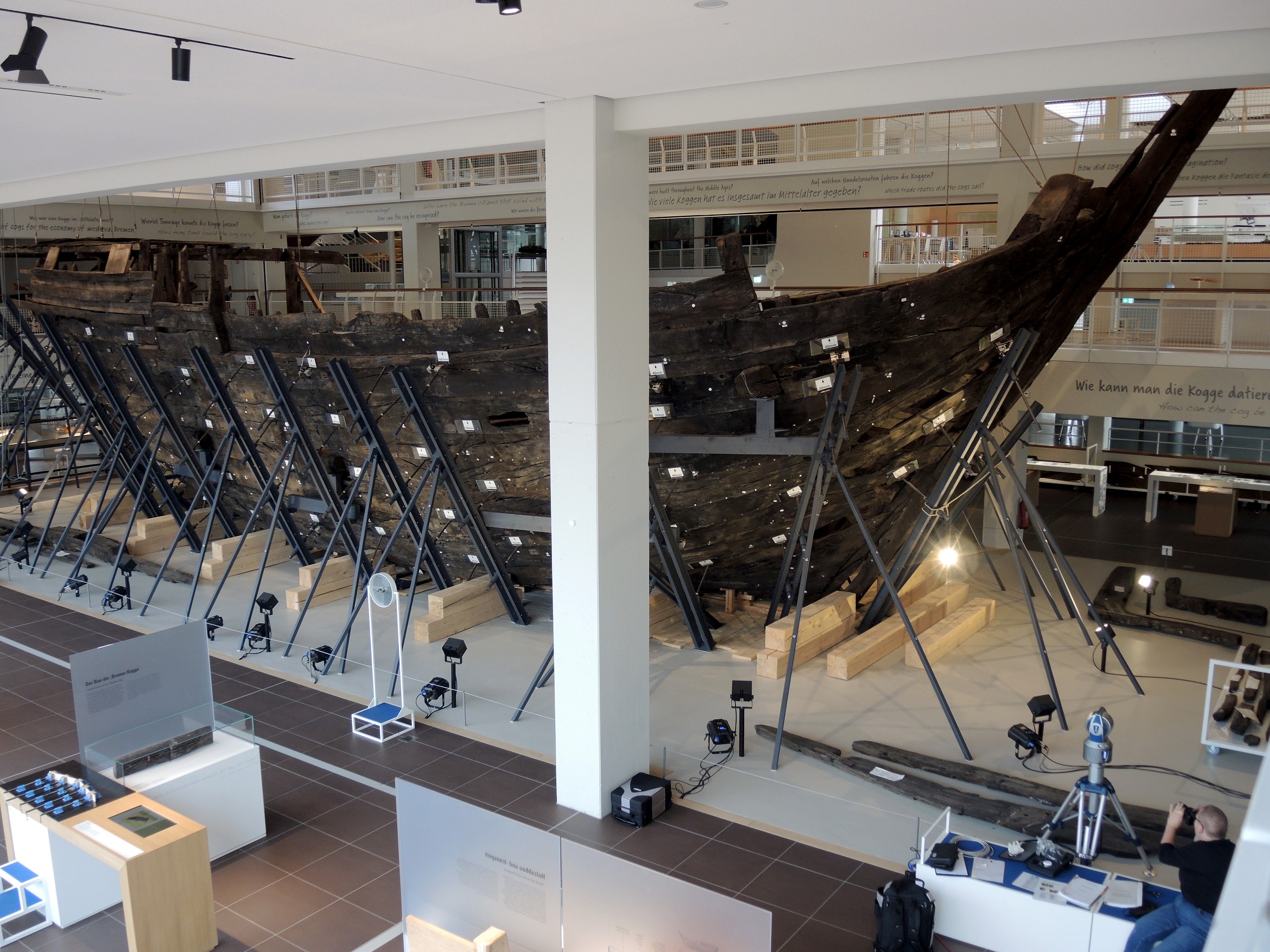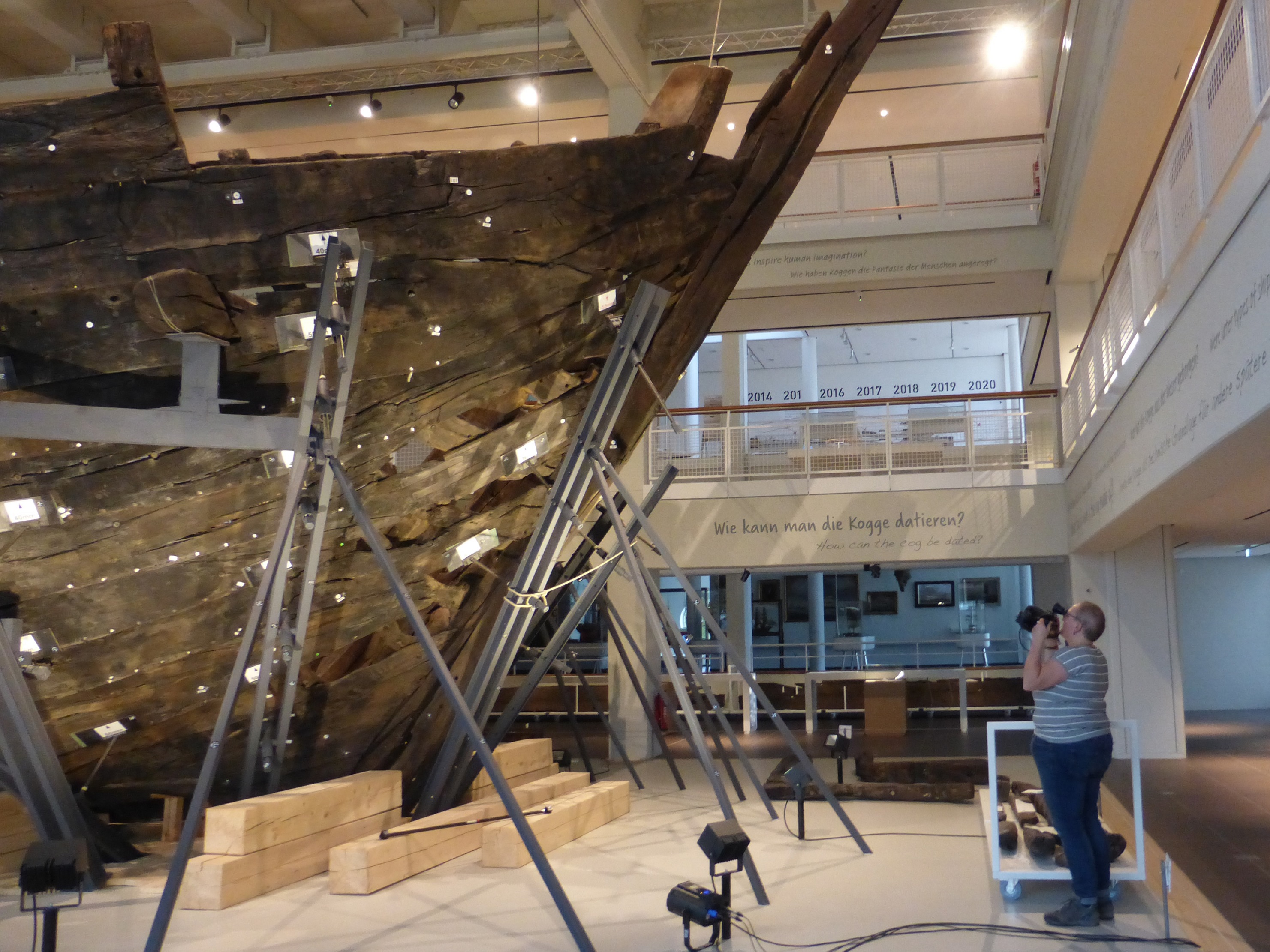 Ein Jahr später wurden schon erste Verformungen festgestellt. Um das Schiff, das bisher an der Decke „aufgehängt“ war, zu stabilisieren, wurde es zusätzlich mit einem Stahlgerüst umgeben. Doch auch die Stahlkonstruktion drückte auf das Holz und trug damit zur Verformung bei, sodass langfristig über ein neues Stützsystem nachgedacht wird. „Denkbar wäre es, die Kogge von innen mit einem Skelett zu füllen, das die Holzelemente zusammenhält“, erklärt Colson. Doch das würde Kosten in Millionenhöhe verursachen. „Bevor wir hier weiterdenken, warten wir erst einmal die Messergebnisse ab.“