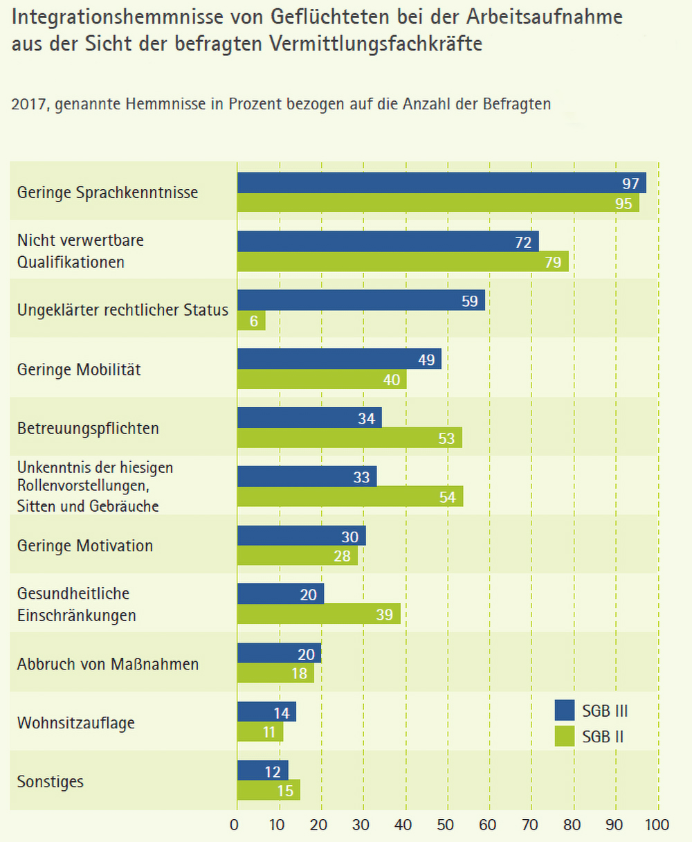 Eine wichtige Aufgabe der Agenturen und Jobcenter bestehe darin, die Geflüchteten beim allgemeinen und berufsfachlichen Spracherwerb zu unterstützen, erklären die Autoren der IAB-Studie. Der Spracherwerb sei erstens eine Voraussetzung für gesellschaftliche Integration, zweitens aber auch notwendige Bedingung für erfolgreiche Qualifizierungsbemühungen. Ohne hinreichende Sprachkenntnisse seien der Erwerb von Ausbildungsabschlüssen und innerbetriebliche Aufstiege kaum möglich.