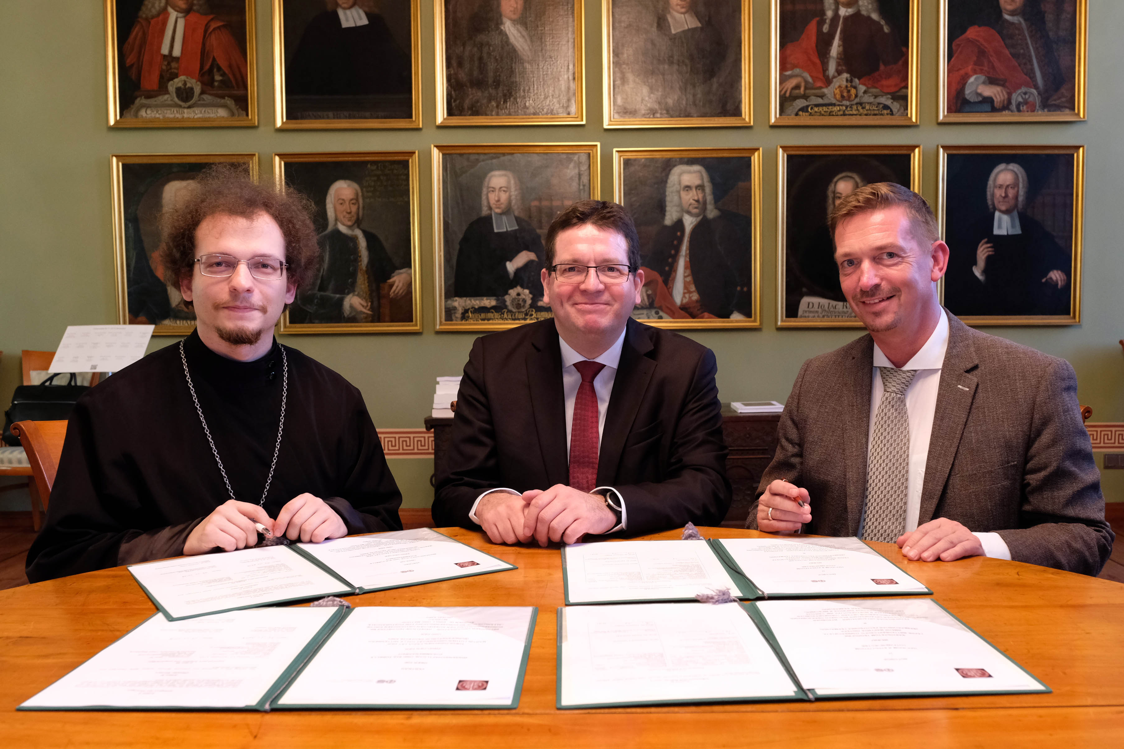 Diese Partnerschaft ist bedeutend: Heute haben Prof. Dr. Christian Tietje, Rektor der Martin-Luther-Universität Halle-Wittenberg (MLU), und Prof. Dr. Daniel Cyranka, Dekan der Theologischen Fakultät, mit dem stellvertretenden Dekan des Moskauer Theologischen Postgraduierten-Instituts "Kyrill und Method" Pavel Tscherkassow eine Vereinbarung über die akademische Zusammenarbeit beider Einrichtungen unterzeichnet. "Kyrill und Method" ist seit 100 Jahren die erste theologische Hochschule Russlands, die eine staatliche Akkreditierung erhalten hat.