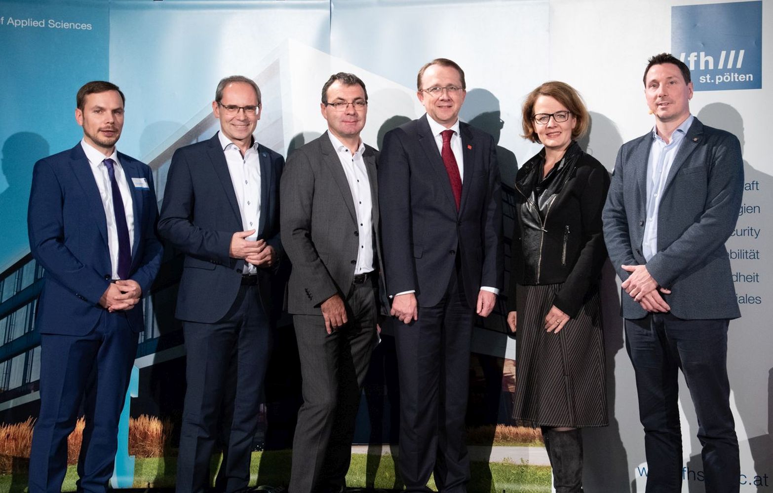 - Gruppenfoto Bühne, v.l.n.r.: Thomas Brandstetter (FH St. Pölten), FH-Geschäftsführer Gernot Kohl, Johann Haag (FH St. Pölten), Bürgermeister Matthias Stadler, Landesrätin Christiane Teschl-Hofmeister, Kevin Jones (Airbus)