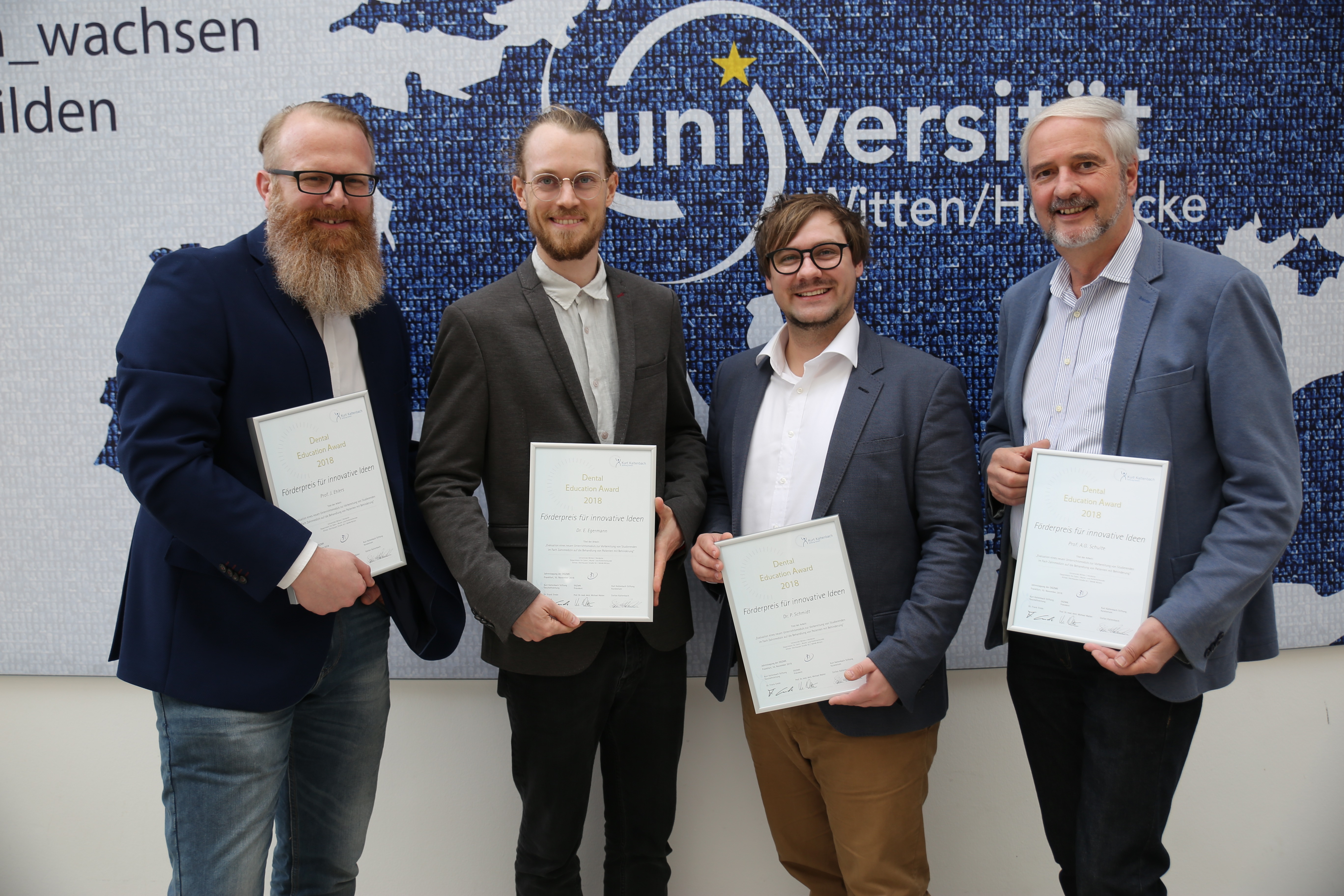 Die Art und Weise, wie die Universität Witten/Herdecke die Studierenden der Zahnmedizin auf die Behandlung von Behinderten vorbereitet, ist in der letzten Woche beim Deutschen Zahnärztetag 2018 ausgezeichnet worden. Eine Arbeitsgruppe der Universität Witten/Herdecke, bestehend aus Prof. Dr. Andreas Schulte, Dr. Michael Egermann, Dr. Peter Schmidt (Lehrstuhl für Behindertenorientierte Zahnmedizin) und Prof. Dr. Jan Ehlers (Lehrstuhl für Didaktik und Bildungsforschung im Gesundheitswesen) erhielt einen der drei Förderpreise für Innovative Ideen der Kurt-Kaltenbach-Stiftung. An der Preisverleihung war auch die Deutsche Gesellschaft für Zahn-, Mund- und Kieferheilkunde (DGZMK) beteiligt, die wissenschaftliche Dachorganisation für zahlreiche unterschiedliche zahnmedizinische Arbeitsgemeinschaften und Arbeitskreise.