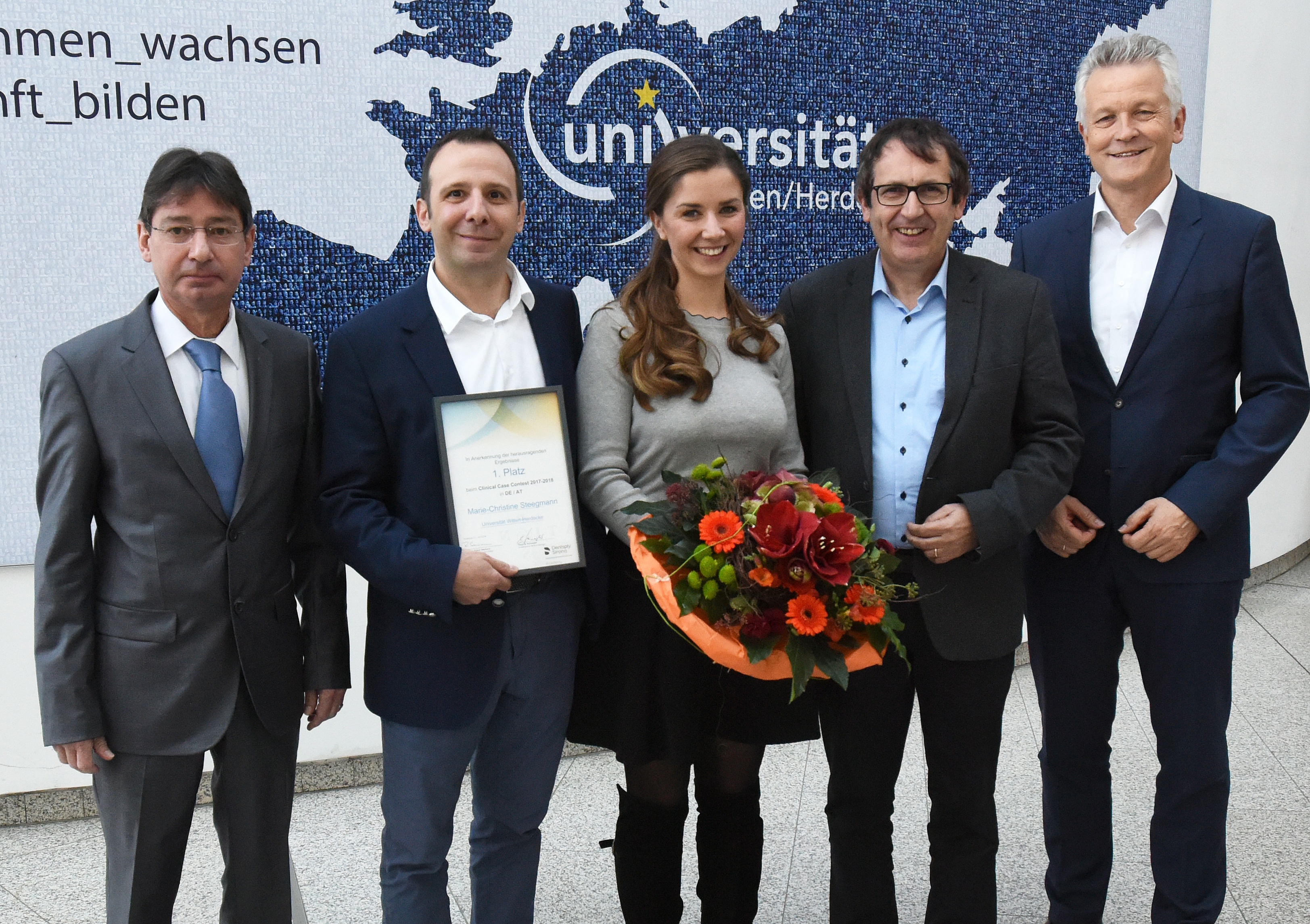 Marie-Christine Steegmann hat den ersten Preis im „Clinical Case Contest 2017/18“ für die Länder Deutschland und Österreich gewonnen. Die von der Firma Dentsply Sirona gesponserte renommierte Auszeichnung geht damit zum fünften Mal an die Universität Witten/Herdecke (UW/H). Am 16. November nahm die junge Zahnärztin, die im Dezember 2017 ihr Zahnmedizin-Studium an der UW/H abgeschlossen hat, die Ehrung aus den Händen von Siegmar Schwegler, Professional Service Manager Universitäten bei Dentsply Sirona, entgegen.