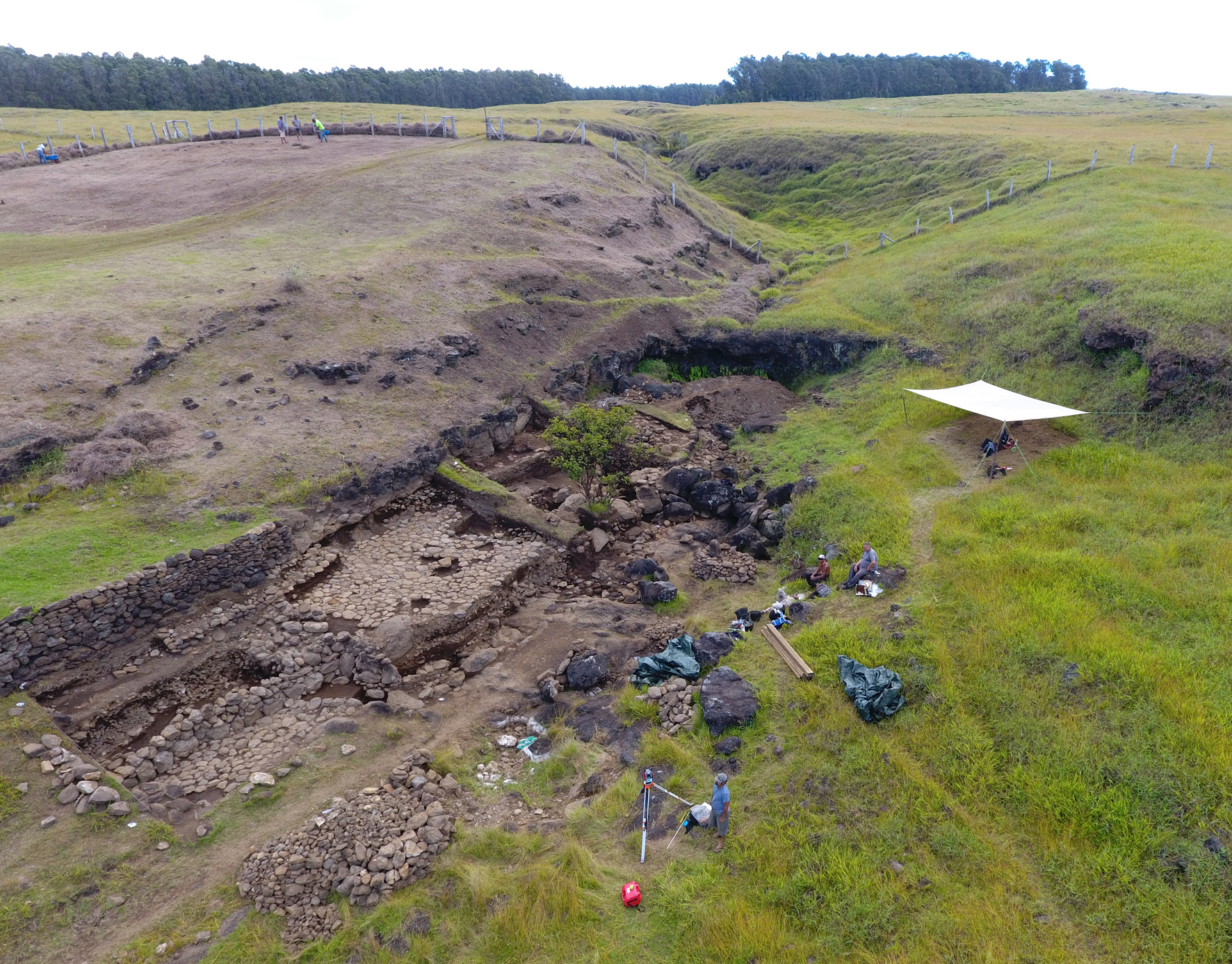 Zunächst ebenfalls überraschend sind die gewaltigen Mengen von Stein- und Schottermaterial, die die ehemaligen Osterinsel-Bewohner bewegt haben, um ältere Anlagen wie Wasserbecken und Kanäle mit monumentalen Terrassen zu überbauen. Die Terrassen scheinen die früheren Installationen förmlich zu versiegeln und von einer weiteren Nutzung auszuschließen. Zusammen mit den anderen Befunden liegt die Vermutung nahe, dass damit der Zugang zum Wasser des Baches gesellschaftlich und religiös sanktioniert und durch Tabus reglementiert wurde. Gestützt wird die These durch mehrere Gruben, in denen man rotes Pigment herstellte. Rot gilt in Polynesien als heilig und repräsentiert spirituelle Kraft, physische Stärke und Fruchtbarkeit. Auch Seen, Brunnen, Becken und Quellen – wie etwa der Wasserfall von Ava Ranga Uka a Toroke Hau – sind im polynesischen Kulturkreis heilige Orte, an denen Götter und Geister wohnen.