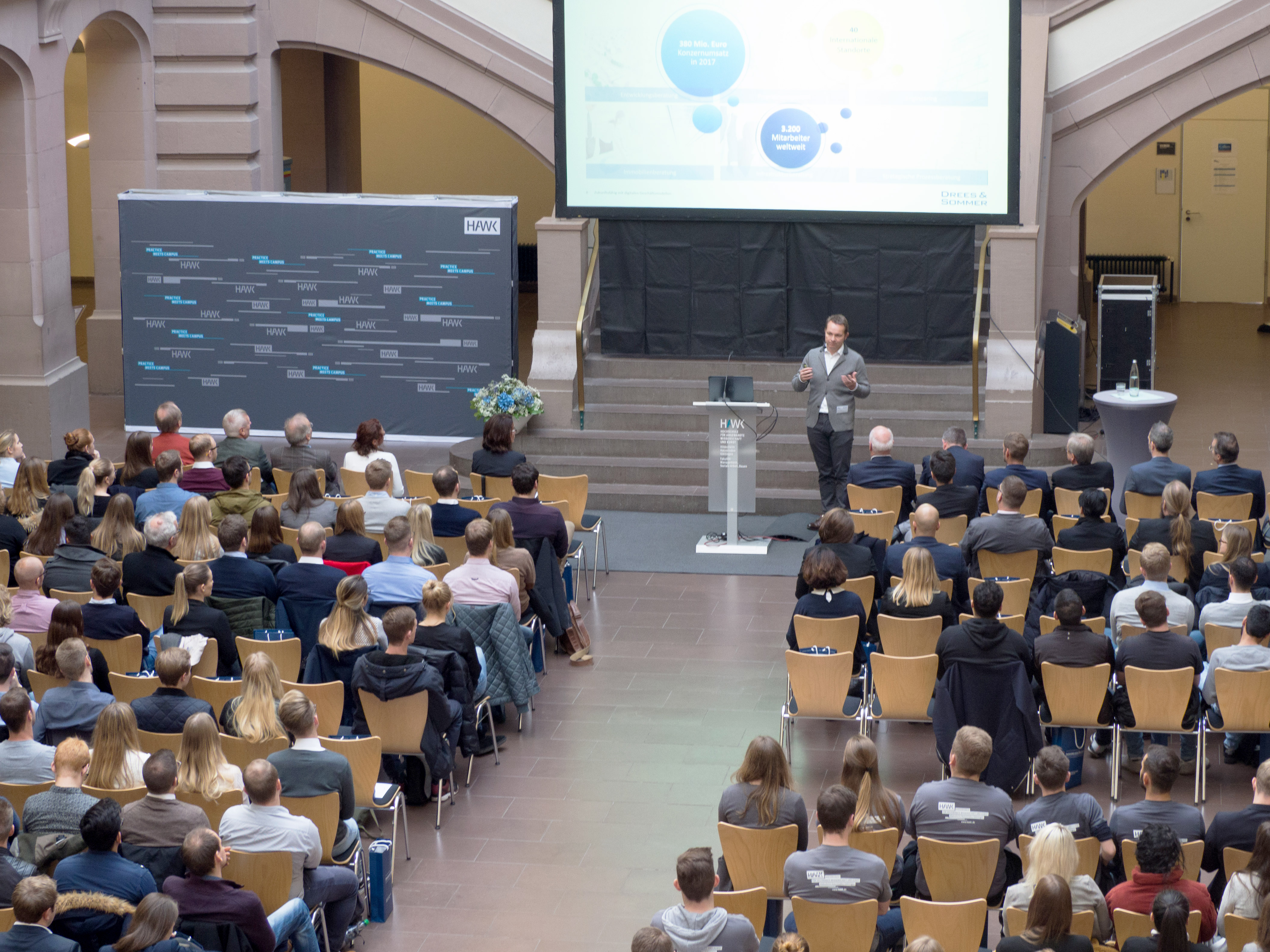 Was bedeutet die Digitalisierung für die Immobilienwirtschaft? Welche Bereiche verändern sich? Und wie können Unternehmen diese Veränderungen aktiv mitgestalten? Norman Meyer, Leiter Digitale Geschäftsmodelle bei der Drees & Sommer SE in Stuttgart, beantwortete diese Fragen beim fünften Personalmanagementkongress „Practice meets Campus“ an der HAWK in Holzminden. Die Veranstaltung bietet Firmen und Studierenden der Immobilienwirtschaft die Möglichkeit, Kontakte zu knüpfen und sich fachlich auszutauschen. Gesprächsstoff liefert die Keynote zu Beginn des Events, die traditionell ein aktuelles Thema der Branche in den Blick nimmt – in diesem Jahr: digitale Geschäftsmodelle. Zuvor begrüßte Dekan Dr. Ulrich Hundertmark das Publikum im Lichthof der Fakultät und übergab das Wort zur Moderation an die Projektleiterin und Initiatorin des Kongresses, Prof. Dr. Susanne Ertle-Straub.