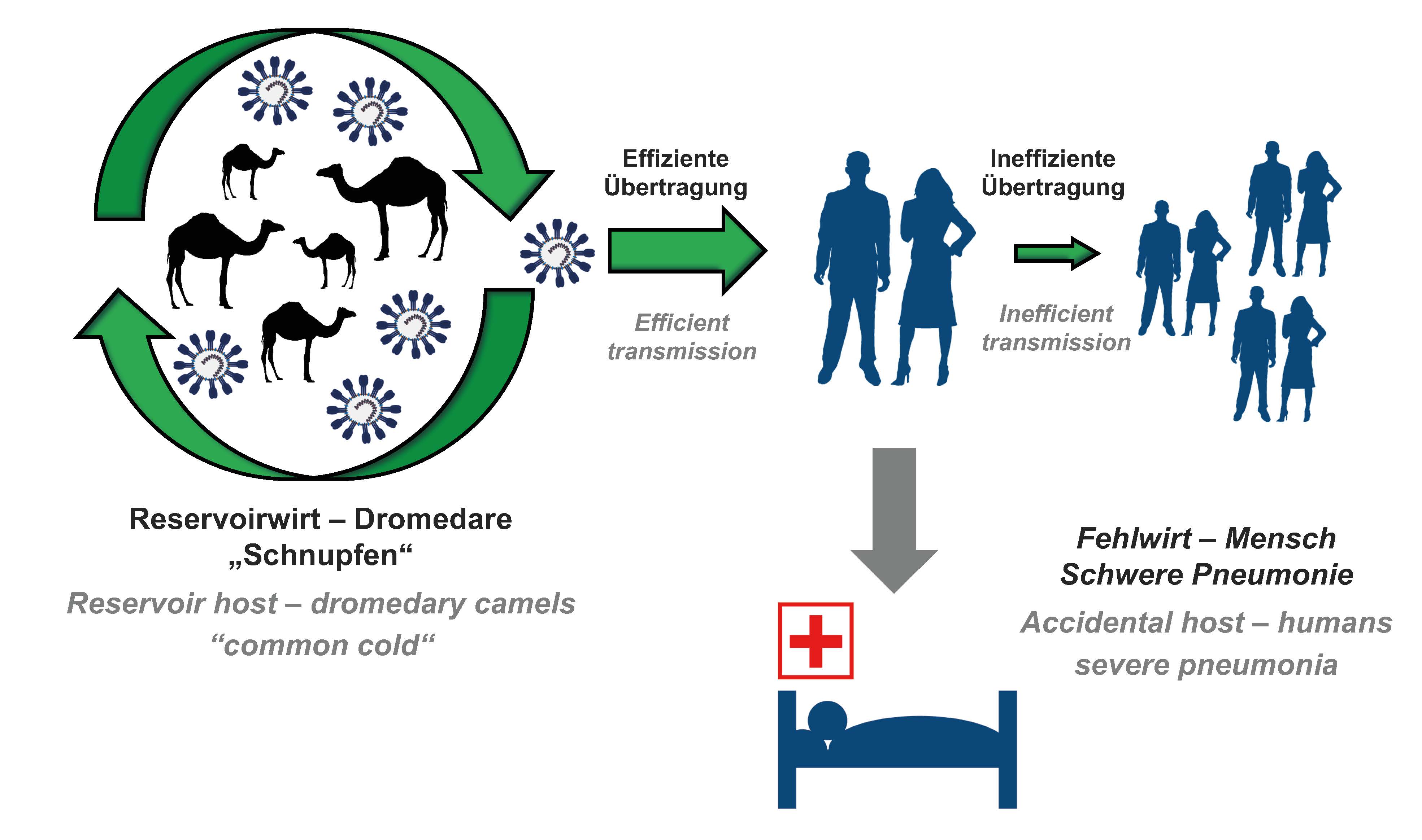 Just like the dreaded SARS virus, the MERS virus and several usually harmless common cold viruses belong to the coronaviruses. Some coronaviruses can be transmitted from animals to humans. The MERS virus infection in dromedary camels causes only a mild cold. In contrast, human infection can lead to a severe respiratory disease, Middle East Respiratory Syndrome (MERS), which is often fatal. The disease is most prevalent in the Arabian Peninsula where people are infected by dromedary camels that are kept for food and racing. The virus's potential to spread worldwide became apparent in 2015 when an infected person who had previously visited the Arabian Peninsula travelled to South Korea and transmitted the virus to others, resulting in 186 infections and 38 fatal MERS cases.