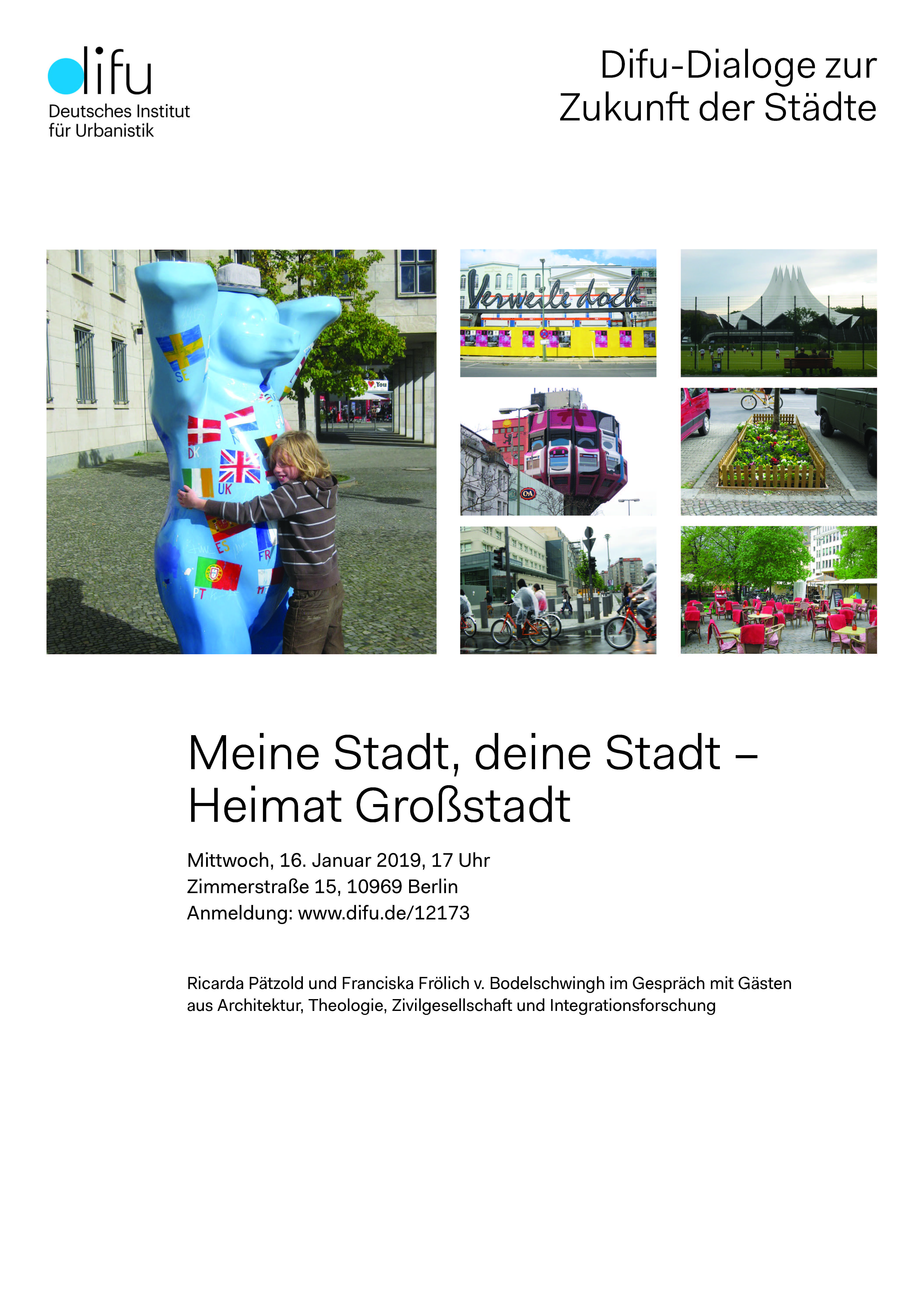 Eine Schlagzeile des Sommers lautete „Gebürtige Berliner sind in der Hauptstadt eine Minderheit“. Bedeutet das etwas für Zusammenleben und Stadtgefühl? „Heimat“ ist ja wieder in aller Munde – ob im Namen von Ministerien, als Gegenstand ironischer Kommentare oder als bedrohtes Schutzgut. Im Alltagsverständnis dominieren grüne Wiesen, Kirchtürme und Gamsbärte die Heimat-Assoziationen. Doch ebenso wie das „Land“ ist auch die Großstadt Heimat vieler Menschen. Bei allen Schwierigkeiten sich mit dem abstrakten und unbestimmten Heimat-Begriff zu befassen, weist das breite Echo auf eine Fehlstelle hin: In vielen technisch geprägten Debatten um die Zukunft von Städten wird ein Gefühl vermisst, das auch Zugehörigkeiten beschreibt. Im Difu-Dialog soll es sowohl um eine Verständigung über Interpretationen des Heimatbegriffs als auch um die vielfältigen Formen der „Beheimatungspraxis“ gehen.