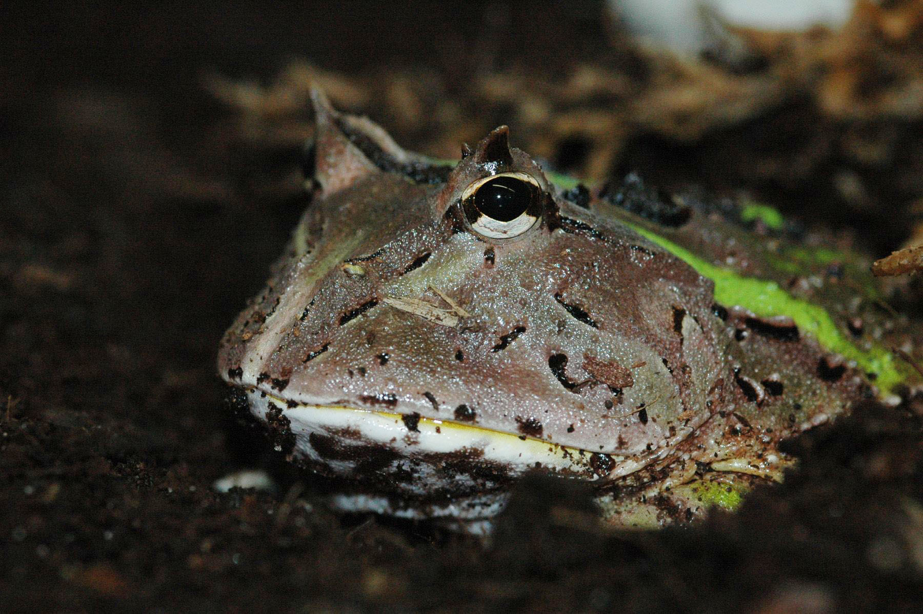 Bildunterschrift: Die südamerikanischen Hornfrösche sind Lauerjäger, die halb eingegraben darauf warten, dass sich ihnen Beutetiere nähern.