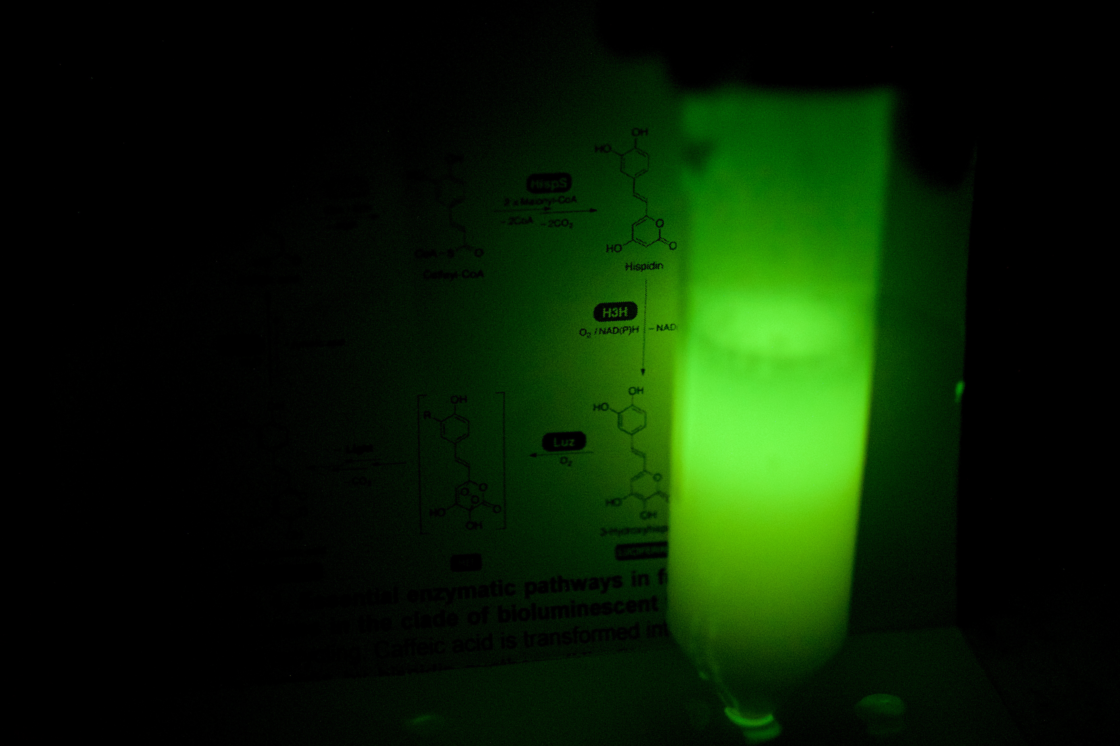 Mit dem Wissen, wie biolumineszierende Pilze leuchten, brachten die ForscherInnen dann nicht-biolumineszierende Eukaryoten zum Scheinen. Sie bauten das Gen, das in Neonothopanus nambi für Luciferase kodiert, und drei weitere Gene, deren Produkte die Kaffeesäure in Luciferin umwandelt, in die nicht-biolumineszierende Hefe Pichia pastoris ein – und die Hefekolonien leuchteten. „Wir gaben der Hefe keine Chemikalie, die sie zum Leuchten bringt. Stattdessen gaben wir ihr die Enzyme, die sie benötigt, um ein bereits in der Hefe vorhandenes Stoffwechselprodukt in Licht umzuwandeln", erklärt Kondrashov.