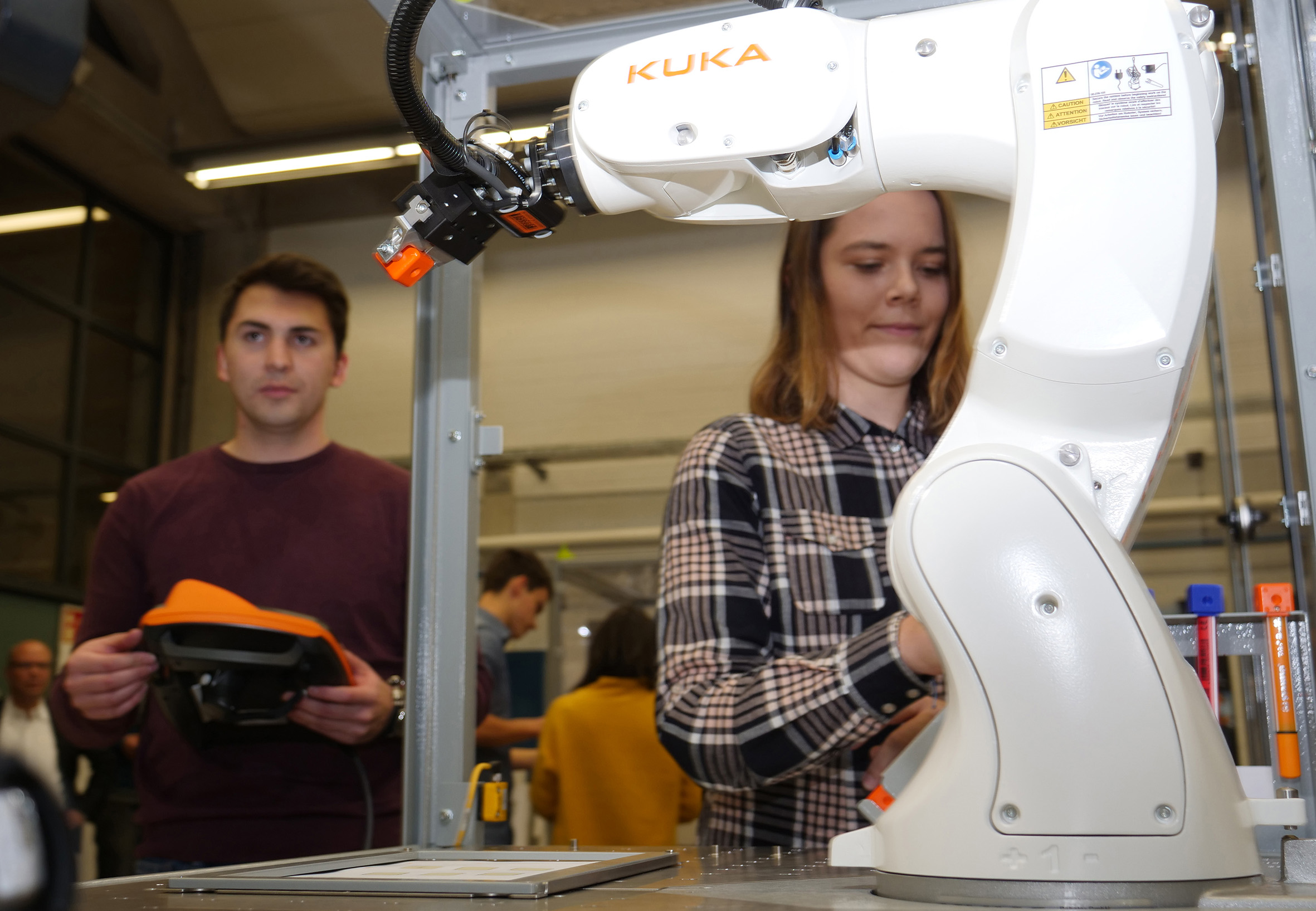 Seit dem Wintersemester 2018/19 haben Studierende die Möglichkeit, modernste Industrierobotersysteme zu steuern und zu programmieren. Sie erwerben damit fundierte Kenntnisse, die auf dem Arbeitsmarkt sehr begehrt sind. Im Anschluss an eine erfolgreiche Prüfung können die Studierenden mit einer weiteren Prüfung ein offizielles KUKA-Trainingszertifikat erwerben.