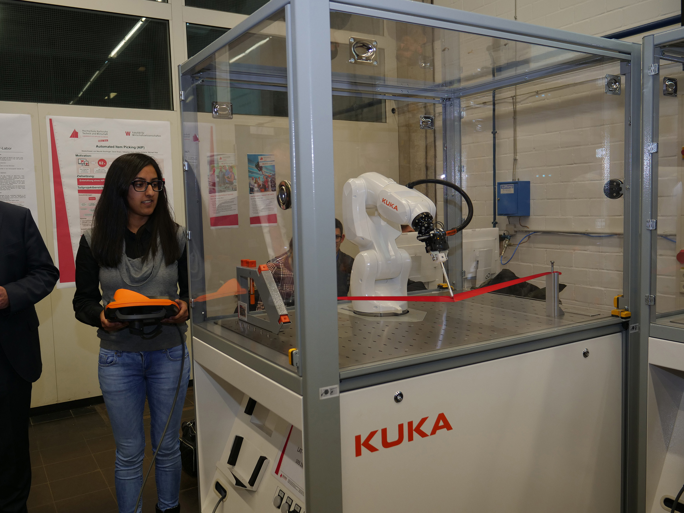 Es war eine fakultätsübergreifende Initiative, die zum Aufbau eines neuen Industrie-Roboter-Labors an der Hochschule Karlsruhe führte. Gemeinsam von den Fakultäten für Elektro- und Informationstechnik (EIT), Informatik und Wirtschaftsinformatik (IWI), Maschinenbau und Mechatronik (MMT) sowie Wirtschaftswissenschaften (W) konnte es konzipiert und realisiert werden.