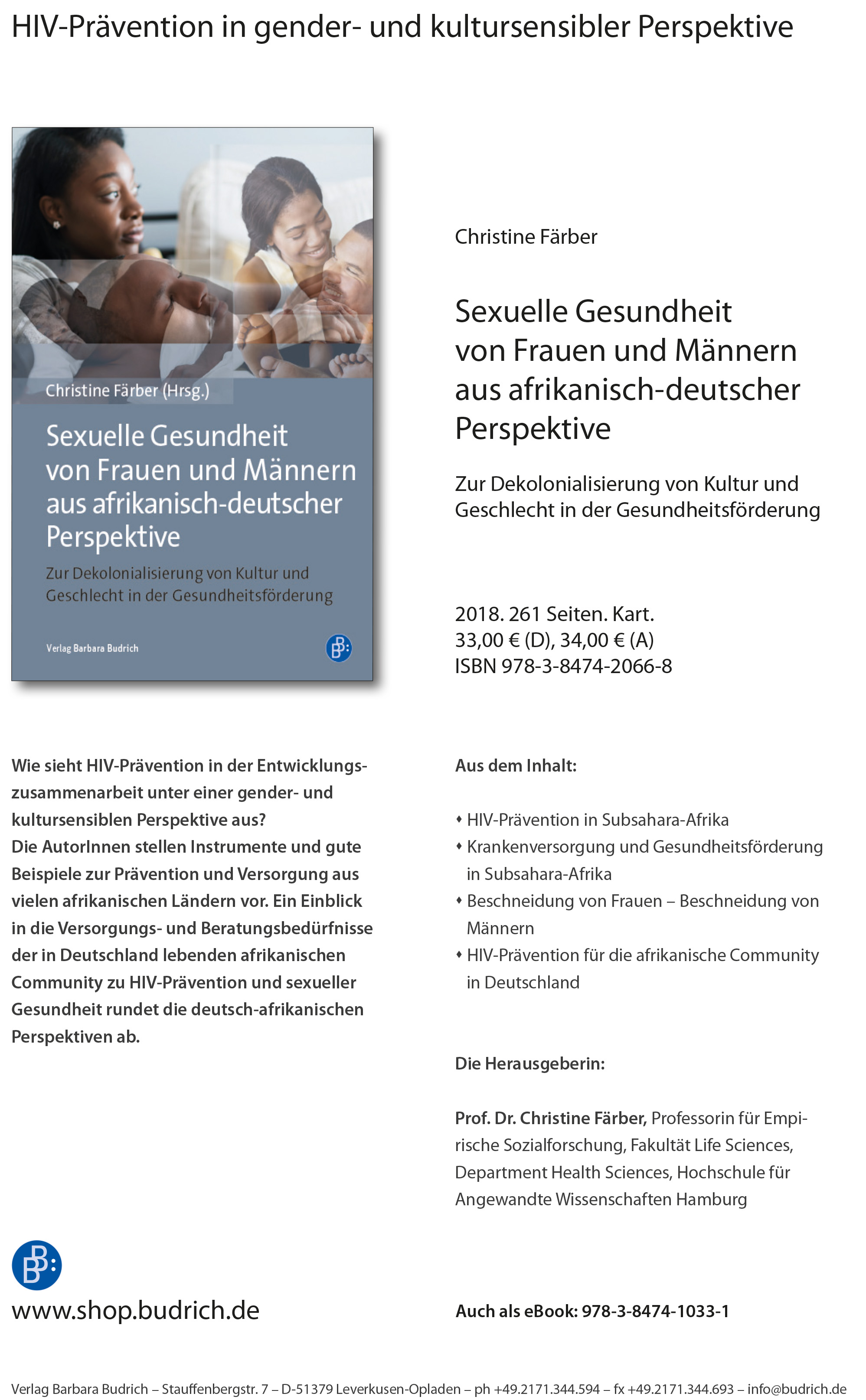 Die Beiträge in der neuen Publikation "Sexuelle und reproduktive Gesundheit und HIV-Prävention aus afrikanisch-deutscher Perspektive" ergeben einen afrikanisch-deutschen Diskurs, in dem Afrikanerinnen und Deutsche zu Wort kommen. Die Autorinnen und Autoren sind Deutsche mit afrikanischen Wurzeln, schwarze Afrikanerinnen in Deutschland, weiße und schwarze Afrikanerinnen in Afrika, schwarze und weiße Deut-sche, die in Afrika gelebt, gearbeitet und geforscht haben, sowie Aktivist/innen der HIV-Prävention in Deutschland und in der deutschen internationalen wirtschaftlichen Zusammenarbeit. Alle Autoren haben am Department Gesundheitswissenschaften der HAW Hamburg studiert.