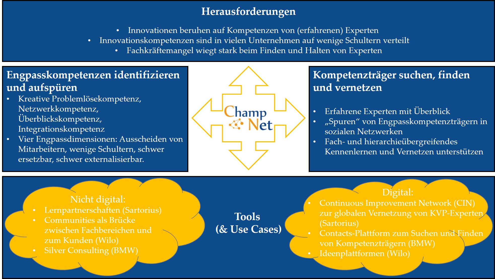 Ziel von ChampNet war es, praxistaugliche Methoden zu entwickeln, um die zentralen Kompetenzträger in Unternehmen arbeitsintegriert und fachübergreifend zu vernetzen und so die identifizierten innovationsrelevanten Engpasskompetenzen bei einer breiten Gruppe von Beschäftigen zu verankern. Die beteiligten Unternehmenspartner – Wilo, Sartorius und BMW – erarbeiteten und erprobten mit ihren Mitarbeitern dazu geeignete Off- und Online-Formate, die umfassend evaluiert, in die Personalentwicklung der Unternehmen integriert und durch Enterprise Social Networks (ESN) unterstützt wurden.