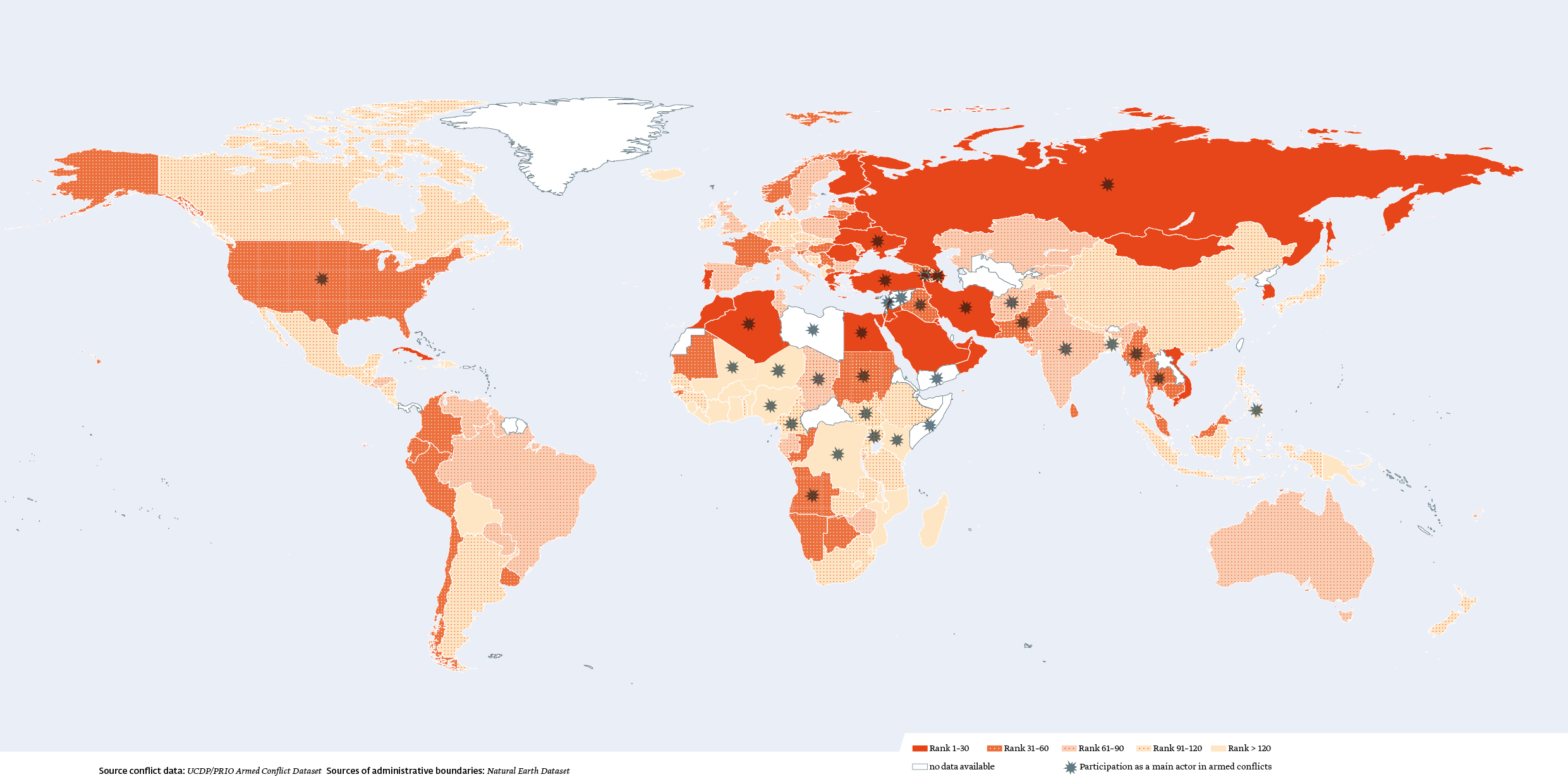 Israel, Singapore, Armenia, Cyprus, South Korea, Russia, Greece, Jordan, Brunei and Belarus are in the top 10 of the GMI 2018 (positions 1 to 10). “These countries allocate particularly high levels of resources to the military in comparison to other areas of society”, Max Mutschler and Marius Bales explain. Despite dwindling revenues from the oil trade, militarization in the Middle East remains, by international standards, at a very high level. All countries in the region, except Iraq (position 41), can be found among the 30 most heavily militarized countries in the world. “Political and religious rivalries, as well as many high-intensity armed conflicts (such as in Yemen, Iraq and Syria), are the drivers of this high level of militarization”, the authors analyze.