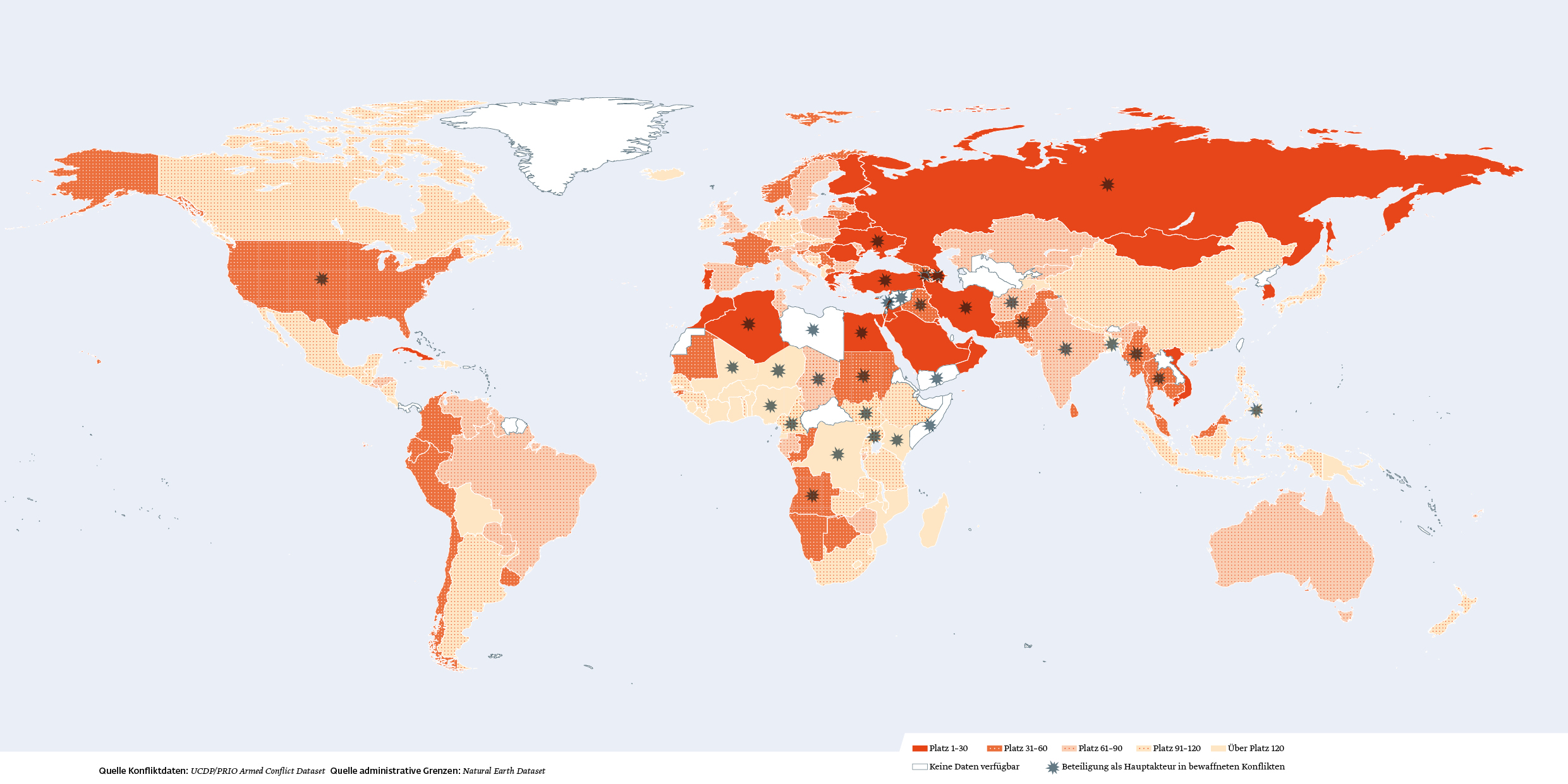 Der Militarisierungsgrad der Ukraine stieg um einen Platz auf Position 14, was den Militarisierungstrend seit 2014 fortsetzt. „Wir sehen diesen Trend im Zusammenhang mit der Entwicklung des Konflikts zwischen Russland und der Ukraine, der gerade eine erneute Zuspitzung erlebt“, unterstreichen die Autoren.