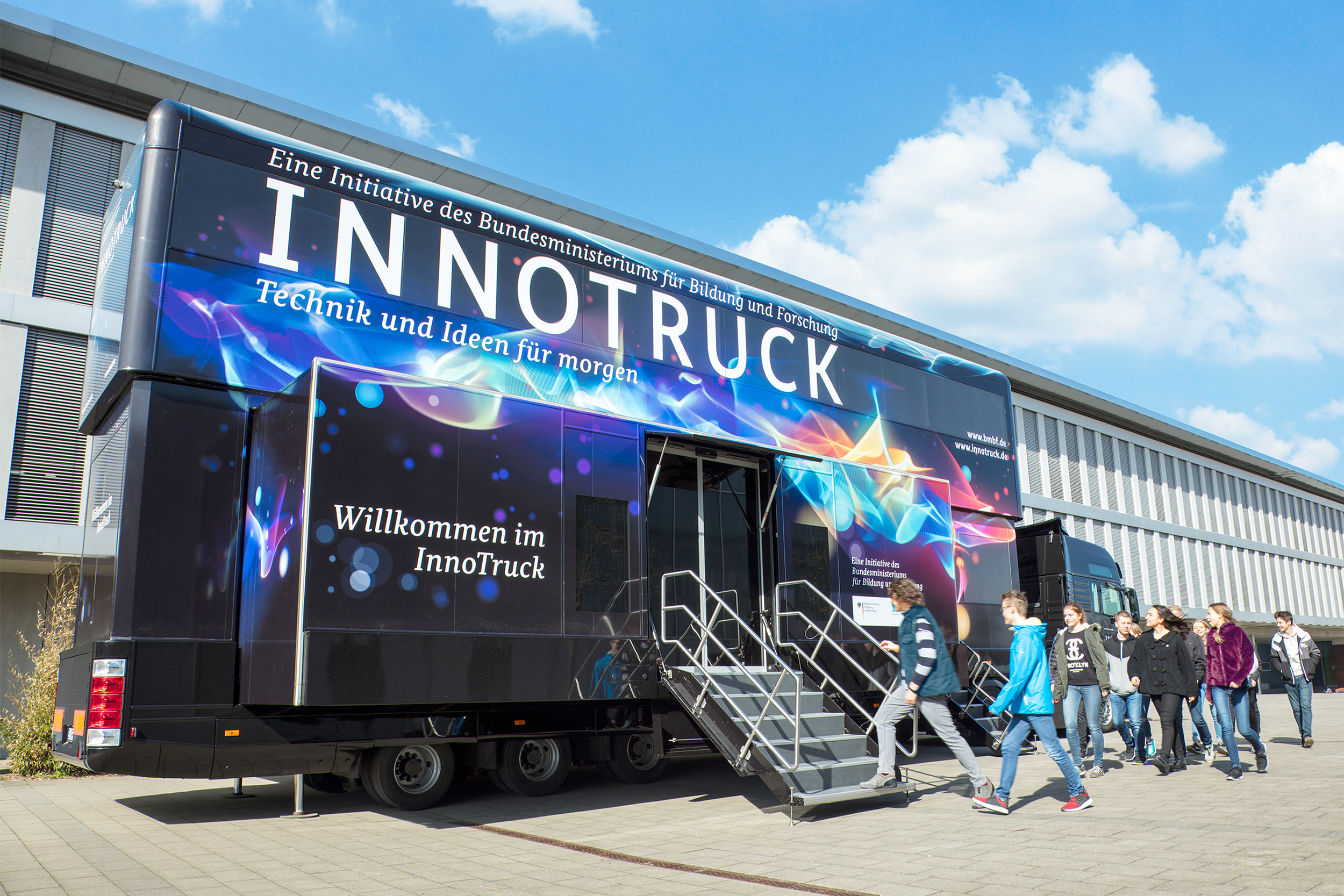 Das Ausstellungsfahrzeug steht am HIT in der Zeit von 8.30 Uhr bis 14.30 Uhr für einen Besuch offen. Auf zwei Stockwerken nimmt der Truck die Gäste mit auf eine spannende Entdeckungsreise in die Technologie: von der Forschung über die Anwendung bis hin zu Berufsbildern. Nicht nur Anschauen – auch Anfassen und Ausprobieren lautet dabei die Devise. Die Besucherinnen und Besucher können selbst in die Forscherrolle schlüpfen und zum Beispiel untersuchen, wie die Elektromobilität der Zukunft auf Basis von Wasserstoff funktionieren kann oder wie die Stromerzeugung nach dem Vorbild der Pflanzen mit einer organischen Solarzelle gelingt. Ziel der Versuche ist es, die Bedeutung technischer Innovationen für den Alltag zu vermitteln und auf diese Weise Begeisterung für wissenschaftlichen Fortschritt zu wecken. Für Führungen durch die Ausstellung sowie Erläuterungen und das intensive Gespräch stehen fachkundige Begleiterinnen und Begleiter im InnoTruck bereit.