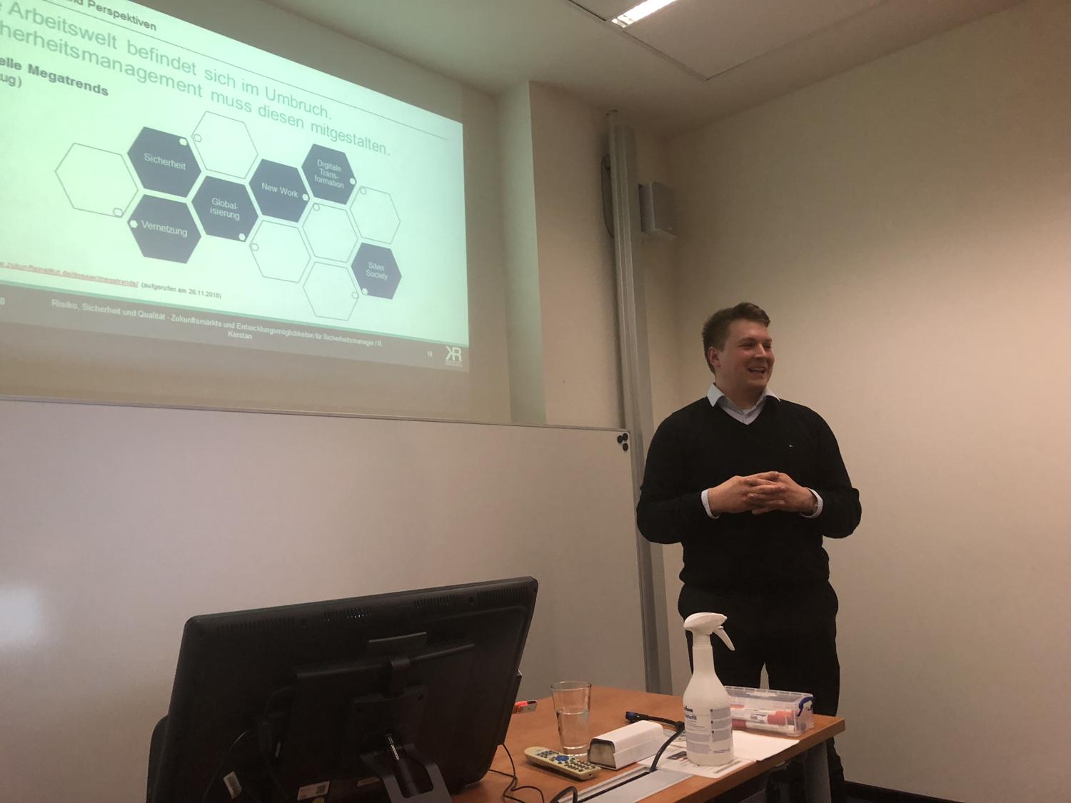 Einen Schwerpunkt des Vortrags von Herrn Kerstan bildete zunächst die Frage nach einem angemessenen Risikomanagement, welches sich an den tatsächlichen Möglichkeiten und Rahmenbedingungen orientiert und nicht in scheinrationale Klassifizierungen verfällt. Darüber hinaus stellte er Entwicklungsszenarien für die künftige Nachfrage nach Sicherheit vor und leitete daraus die Anforderungen an zukünftige Sicherheitsmanager ab. Zum Abschluss beantwortete Herr Kerstan Fragen der Studierenden und gab ihnen Tipps für anstehende Praktikumsbewerbungen sowie den Berufseinstieg mit auf den Weg.