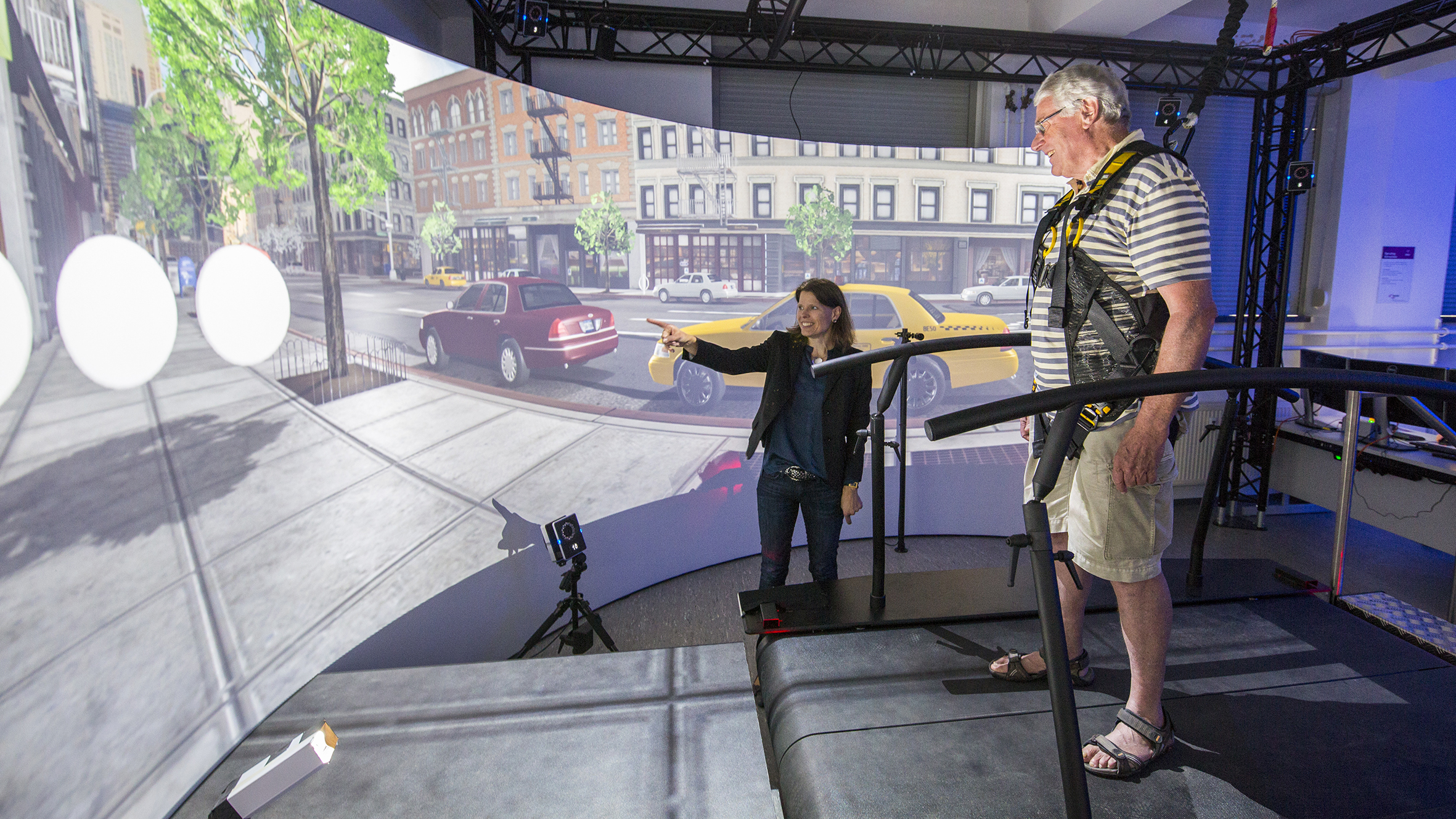 GRAIL bietet eine hochauflösende, interaktive Laborumgebung für Echtzeit-Ganzkörper-Bewegungsanalysen in verschiedenen virtuellen Realitäten (VR) und ermöglicht den Arbeitsgruppen, ihre Untersuchungen unter realitätsnahen und dennoch sicheren und standardisierten Bedingungen durchzuführen und gleichzeitig die Anzahl an Variablen sowie deren Messgenauigkeit zu erhöhen. „So können im Labor künftig die Rolle des gesunden Alterns sowie die Effekte diverser Krankheitsbilder weitaus besser als bisher über Fächergrenzen hinweg untersucht werden“, erklärt Voelcker-Rehage. Hierbei werden die Versuchspersonen auf einem hydraulisch und um zwei Achsen bewegbaren Laufband in virtuelle Welten versetzt, in denen sie unterschiedliche Bewegungsaufgaben wie Gehen und Laufen oder verschiedene Balanceaufgaben bis hin zu Mehrfachaufgaben mit unterschiedlichen Schwierigkeitsgraden ausführen. Ein 3D Bewegungsanalysesystem und unter der Lauffläche des Laufbands befindliche Kraftsensoren ermöglichen es, alle Bewegungen der Versuchspersonen präzise und in Echtzeit aufzuzeichnen und diese mit dreidimensionalen biomechanischen Mensch-Modellen vor dem Hintergrund aufgabenspezifischer Veränderungen der Bewegung zu analysieren. Die VR kombiniert eine auf eine visuelle 240°-Projektionsfläche projizierte VR mit einem Soundsystem – und sie wird spürbar, indem das Laufband beispielsweise anfängt zu schwanken, wenn die Versuchsperson über eine projizierte Hängebrücke läuft. Und auch Hügel und Kurven eines virtuellen Waldweges können realitätsgetreu simuliert werden. Die Laufbandgeschwindigkeit passt sich an die Ganggeschwindigkeit der Versuchsperson automatisch an und alle Aufgaben können für die individuellen Fähigkeiten der Versuchspersonen justiert werden.