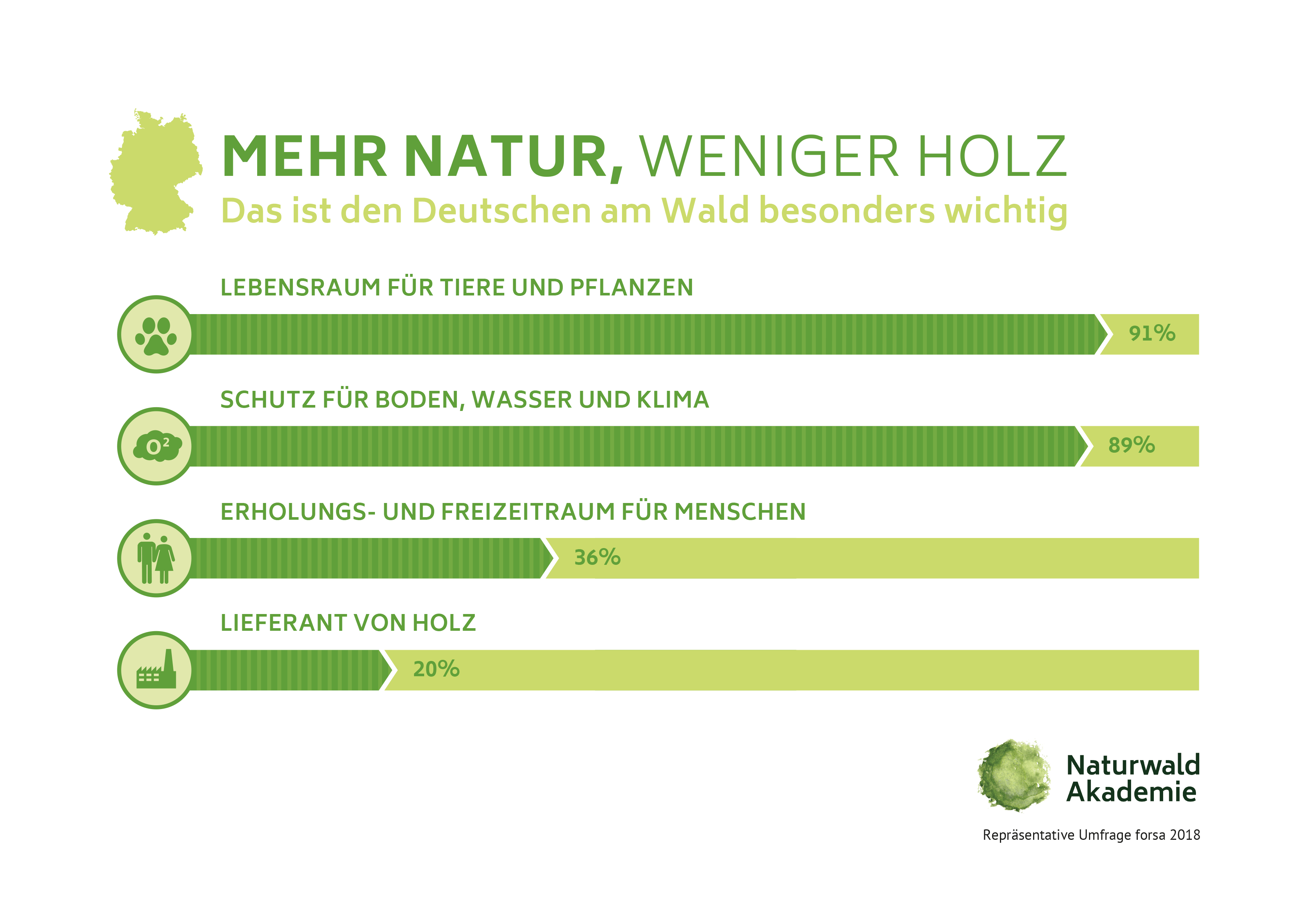 Das Forsa-Institut hat im Auftrag der Naturwald Akademie repräsentativ 1.000 Bürger im Spätsommer 2018 zur „Bedeutung des Waldes“ befragt.