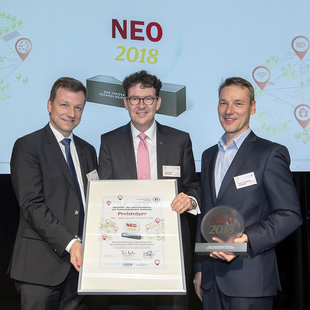 Karlsruhe, 07.12.2018 – Am 6. Dezember 2018 wurde das Forschungsprojekt „Elektrische, vernetzte und autonom fahrende Elektro-Mini-Busse im ÖPNV“ (kurz: EVA-Shuttle) von der TechnologieRegion Karlsruhe mit dem NEO2018 ausgezeichnet. In der Akademiebühne Baden-Baden nahmen Prof. Dr.-Ing. J. Marius Zöllner, Vorstand des FZI Forschungszentrum Informatik, Dr. Alexander Pischon, Geschäftsführer der Verkehrsbetriebe Karlsruhe und Ascan Egerer, technischer Geschäftsführer der Verkehrsbetriebe Karlsruhe, stellvertretend für das Projektkonsortium den Preis für die innovativste Idee für Zukunftsquartiere im Jahr 2018 entgegen. Das Projekt setzte sich im Finale gegen drei Mitbewerber durch.