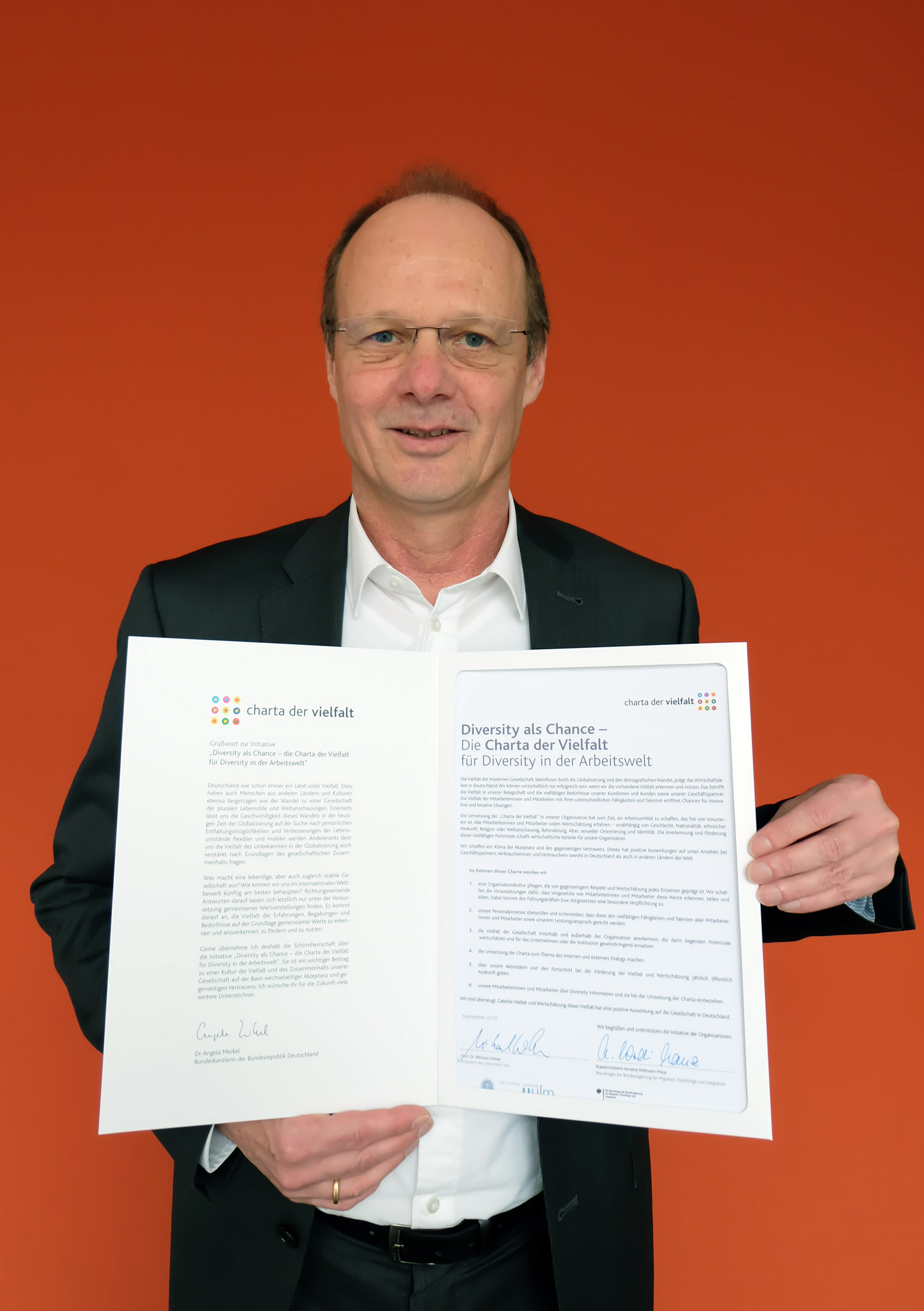 „Diversität ist nicht nur ein Wert an sich, sondern sie schafft arbeitspsychologische wie auch wirtschaftliche Vorteile, indem sie vielfältige Potenziale freisetzt. Gerade wir als Universität profitieren von einer großen Vielfalt an kulturellen Prägungen, Begabungen und Interessen. Dabei verfolgen wir gemeinsam ein großes Ziel, und zwar auf der Grundlage von gemeinsamen Wertvorstellungen“, sagt Professor Michael Weber, Präsident der Universität Ulm. Mit der Unterschrift unter die „Charta der Vielfalt“ verpflichtet sich die Universität Ulm als Arbeitgeber, allen Mitarbeiterinnen und Mitarbeitern Wertschätzung entgegen zu bringen: unabhängig von Geschlecht, Nationalität, ethnischer Herkunft, Religion oder Weltanschauung, Alter, sexueller Orientierung und Identität. Dafür braucht es – wie im Urkundentext formuliert – ein Klima der Akzeptanz und des gegenseitigen Vertrauens.