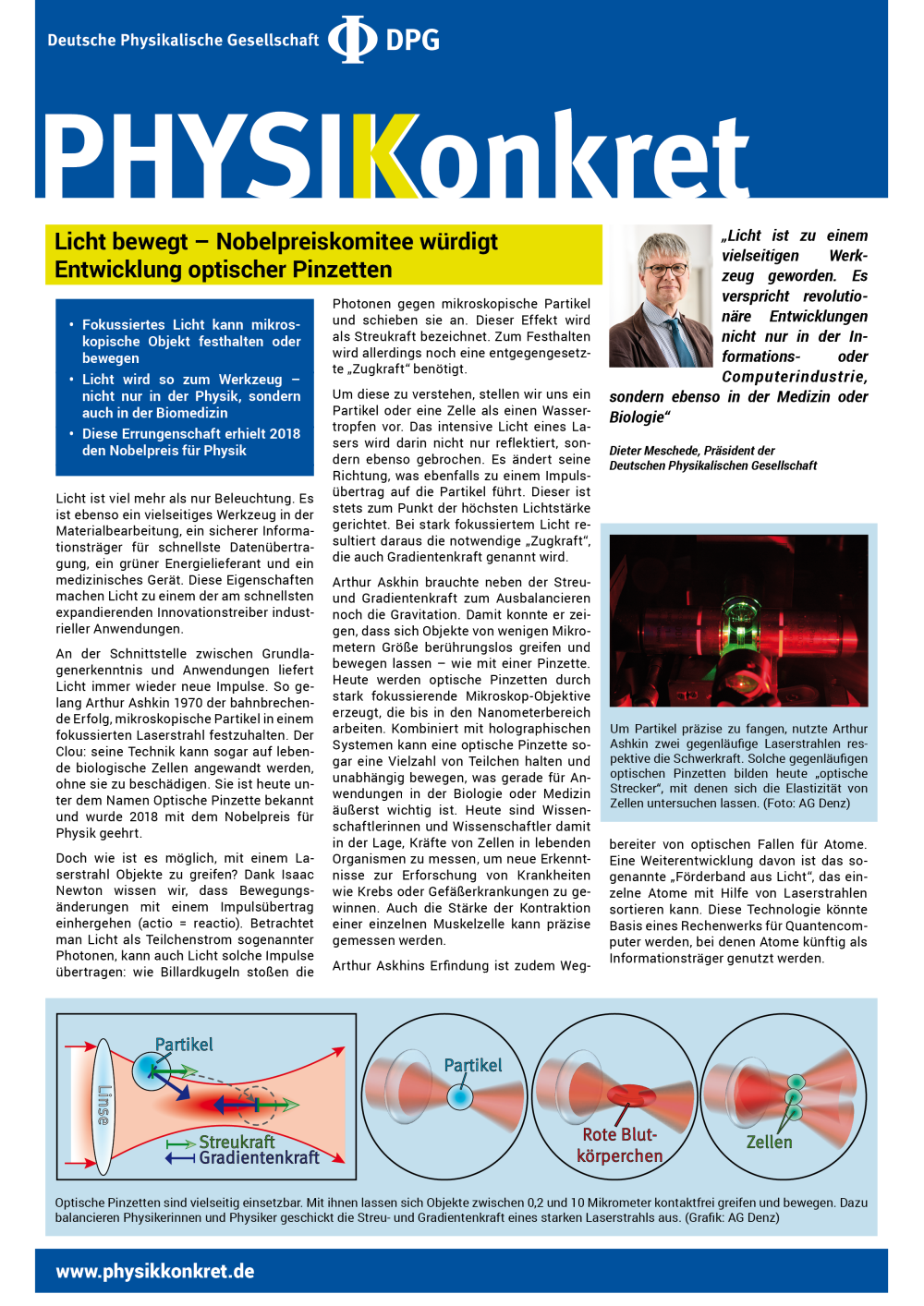 Eine bahnbrechende Entwicklung dieser Art ist die „optische Pinzette“, mit der sich mikroskopisch kleine Partikel oder sogar lebende biologische Zellen festhalten lassen, ohne sie zu beschädigen. Mit optischen Pinzetten lassen sich ferner Kräfte in Organismen messen und auf diese Weise neue Erkenntnisse über Krankheiten wie Krebs oder Gefäßerkrankungen gewinnen. Das aktuelle Physikkonkret der DPG würdigt diese Technik, die in diesem Jahr mit dem Nobelpreis für Physik geehrt wurde, der heute vergeben wird. Eine Weiterentwicklung dieser Erfindung könnte sogar Basis eines Rechenwerks für Quantencomputer werden, was einer Revolution in der Informationsverarbeitung gleich käme.
