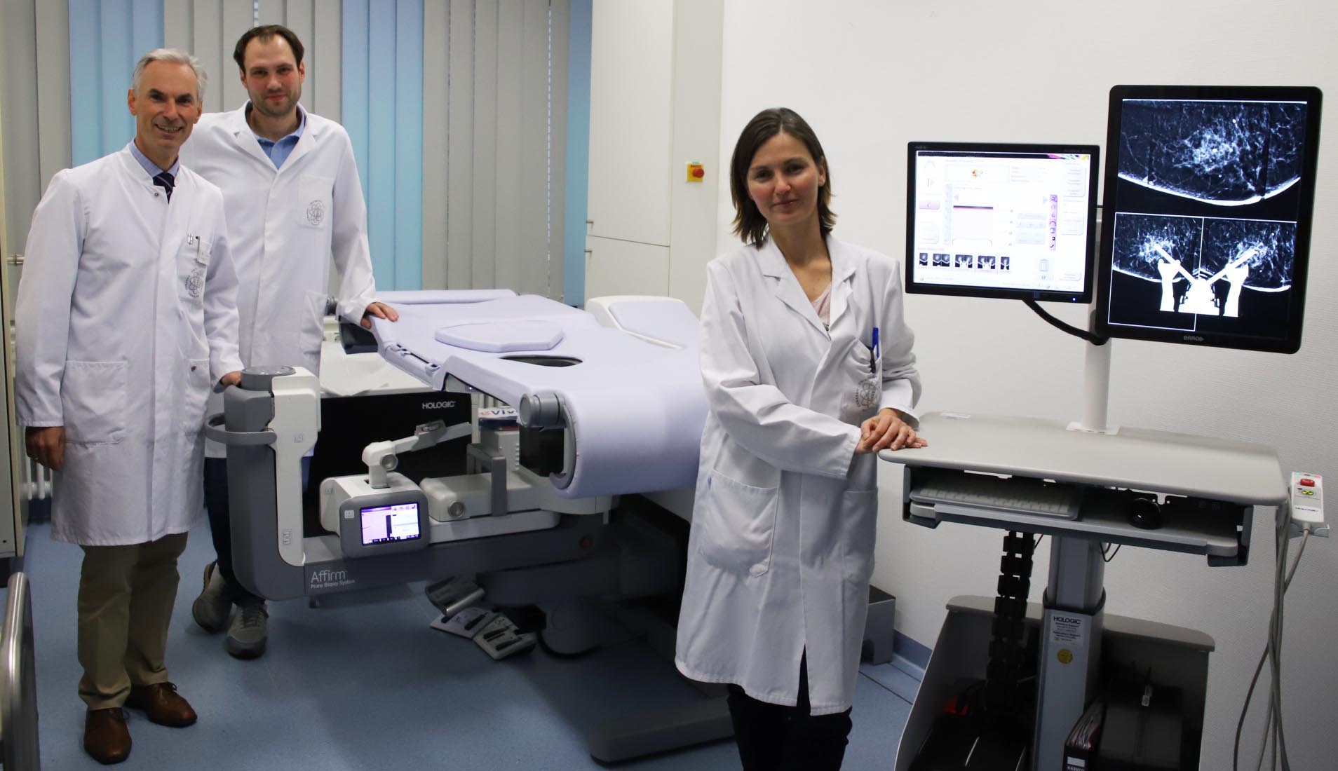 Um Läsionen der Brust, wie sie zum Beispiel bei Brustkrebs oder dessen Vorläufern auftreten, zuverlässig bestimmen zu können, werden im Bereich der diagnostischen Radiologie häufig kleinste Gewebeproben entnommen. Oftmals ist die Entnahme, eine so genannte Biopsie, jedoch für die Patientin nicht sehr komfortabel. Um diesen Prozess, etwa bei Vakuumstanzbiopsien, schneller, angenehmer und genauer zu gestalten, setzt die Klinik für Diagnostische und Interventionelle Radiologie des Universitätsklinikums Ulm seit dem Herbst 2018 einen Biopsietisch der neuesten Generation ein.