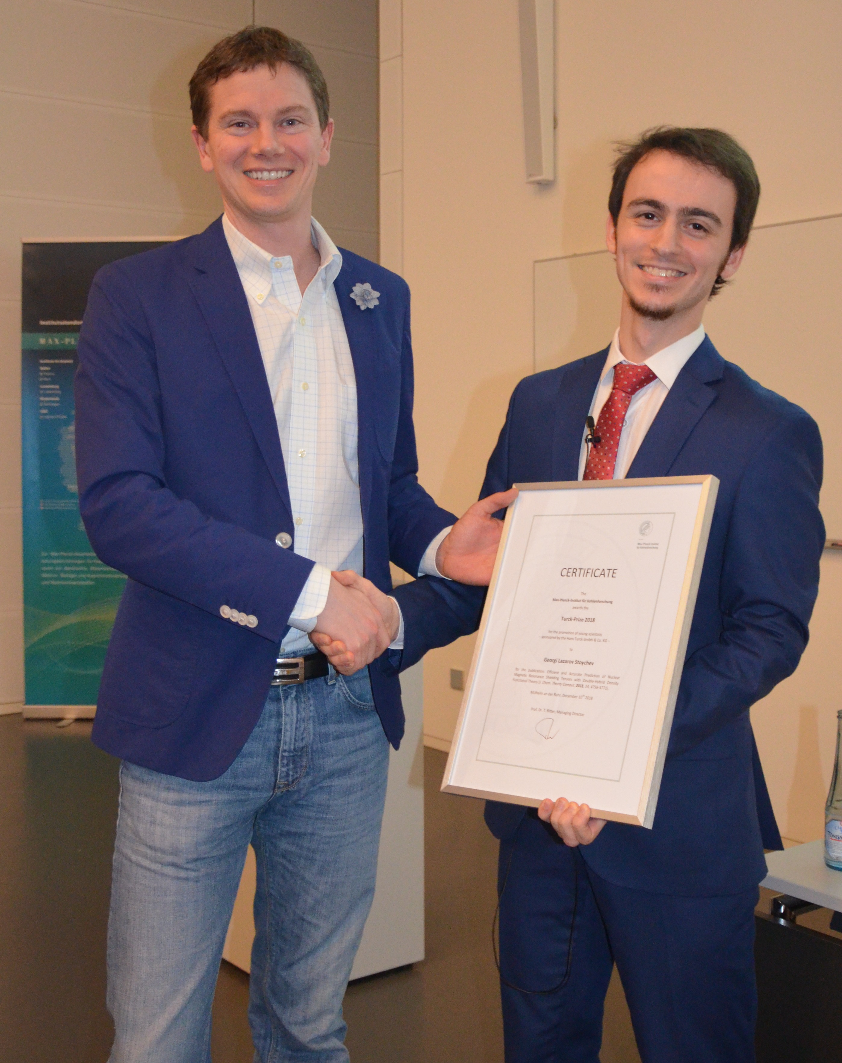 Die Preisübergabe fand am 10. Dezember im Rahmen des großen Institutsseminars durch den geschäftsführenden Direktor am Max-Planck-Institut für Kohlenforschung, Professor Tobias Ritter, statt. Georgi Stoychev stellte seine Forschungsergebnisse mit der Doppelhybrid-Dichtefunktionaltheorie den rund 150 anwesenden Wissenschaftlern vor und erhielt die Turck-Preis-Urkunde aus den Händen des geschäftsführenden Direktors. „Wir haben uns für die Veröffentlichung von Georgi L. Stoychev entschieden, da sein Beitrag zur Vorhersage von Kernresonanzspektren für experimentell und theoretisch arbeitende Chemiker relevant ist“, erklärte Ritter die Entscheidung der Jury.