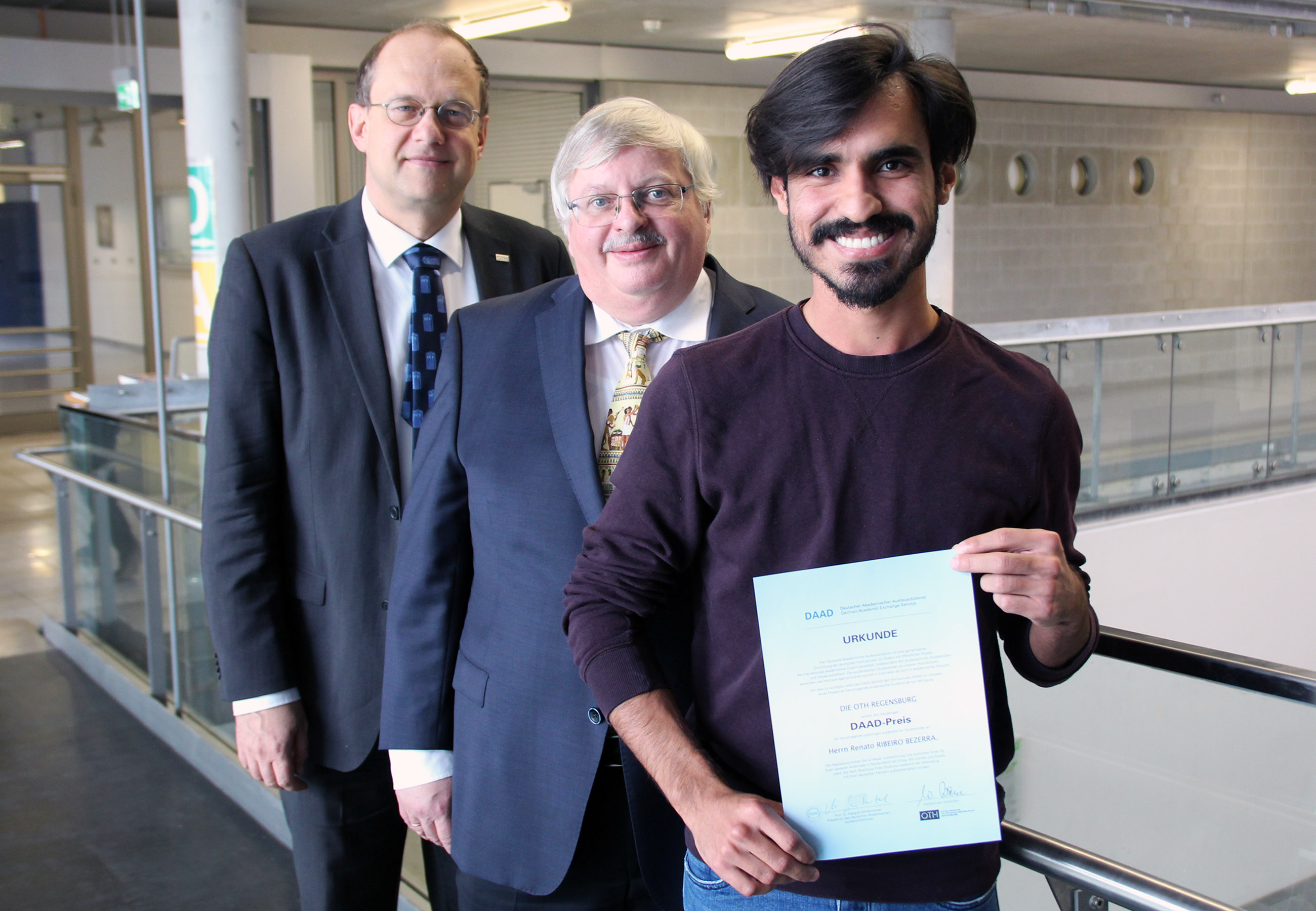 Der DAAD-Preis für hervorragende ausländische Studierende 2018 der OTH Regensburg ist am 10. Dezember 2018 in einer kleinen Feierstunde mit Vizepräsident Prof. Dr. Thomas Fuhrmann, verantwortlich für den Bereich Internationales, und dem Leiter des Akademischen Auslandsamts Dr. Wilhelm Bomke an Renato Ribeiro vergeben worden. Der mit 1000 Euro dotierte Preis wird jährlich an einen Studierenden der OTH Regensburg mit ausländischer Staatsbürgerschaft verliehen; gestiftet wird er vom Deutschen Akademischen Austauschdienst (DAAD). Wesentlich für die Vergabe sind besondere akademische Leistungen. Der diesjährige Preisträger Renato Ribeiro kommt aus Brasilien und studiert im vierten Semester Historische Bauforschung an der OTH Regensburg. Dr. Wilhelm Bomke würdigte besonders seine hervorragenden Noten. „Wir freuen uns sehr, einen solch ausgezeichneten Studierenden aus Brasilien bei uns an der OTH Regensburg zu haben“, so auch Vizepräsident Prof. Dr. Fuhrmann.
