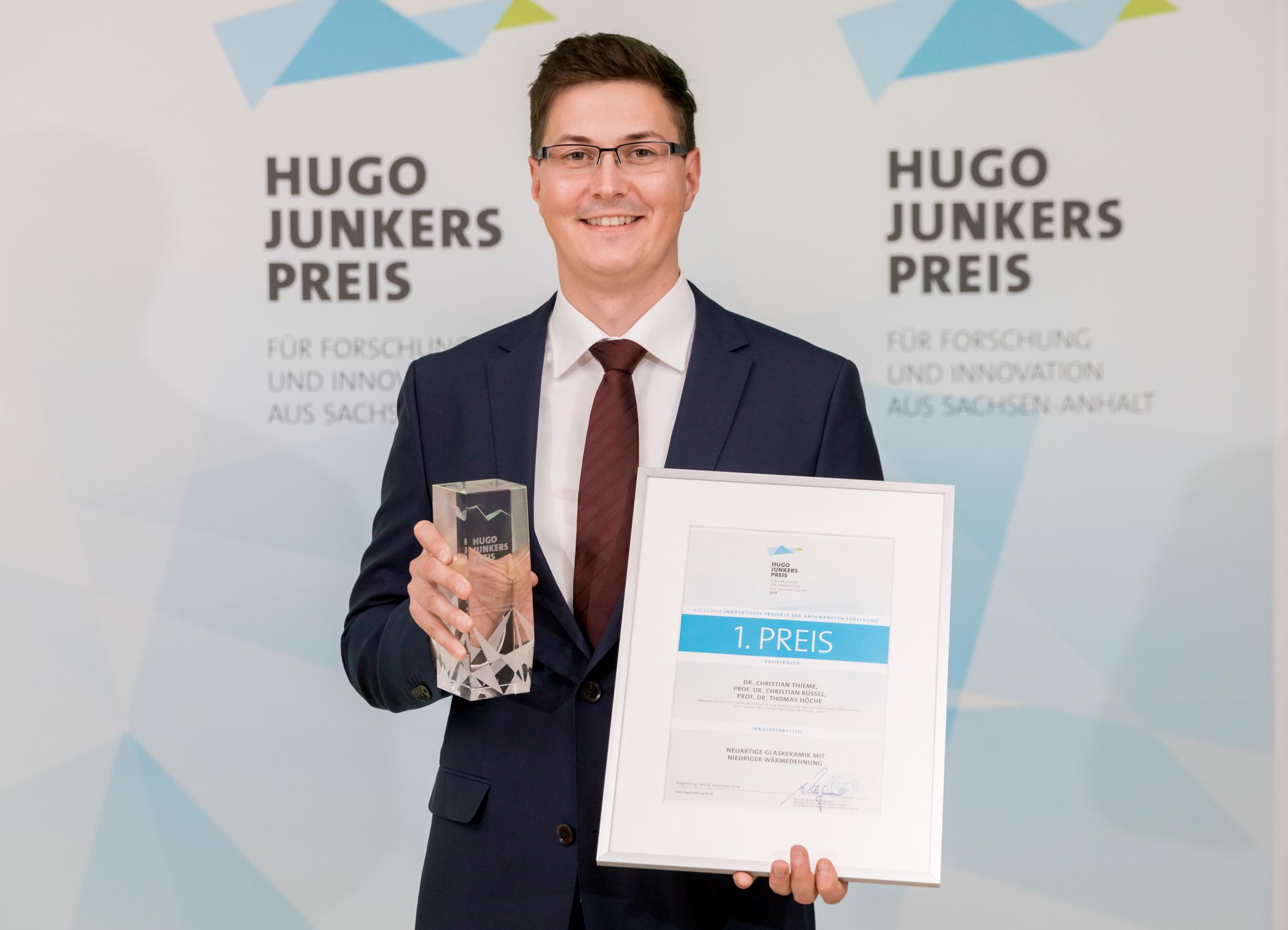 Das Team um Thieme entdeckte ein neues kristallines Material mit der Zusammensetzung Ba1-xSrxZn2Si2O7, das diese seltene Eigenschaft hat. Der große Vorteil hierbei ist, dass die Herstellungstemperaturen dieser neuen Glaskeramiken 100 bis 200 °C unter denen konventioneller Nullausdehnungsglaskeramiken liegen. Außerdem lässt sich das Ausdehnungsverhalten in weiten Temperaturbereichen variabel einstellen. »Diese deutliche Absenkung der Schmelztemperaturen ist ein großer Vorteil. So werden einerseits Energiekosten gespart, andererseits können dadurch auch neue Player in den Markt kommen, die neue Anwendungsfelder in Hightech-Produkten und für den Massenmarkt erschließen. Zudem sind die Ausgangsmaterialien vergleichsweise günstig. So könnten die neuen Glaskeramiken auch durch kleine oder mittelständische Unternehmen hergestellt werden«, sagt Thieme. »Der Hugo-Junkers-Preis ist eine tolle Anerkennung für dieses Projekt, mit dem wir auch aufzeigen, dass in Mitteldeutschland Materialinnovationen auf Weltniveau entstehen können.«
