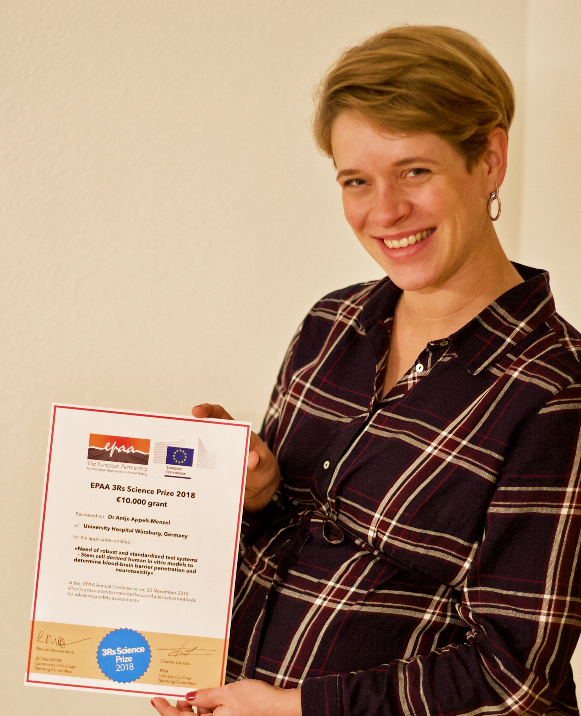 Die Europäische Partnerschaft für alternative Ansätze zu Tierversuchen (EPAA) ehrt mit dem 3R Science Prize wissenschaftliche Arbeiten, die dabei helfen, Tierversuche zu ersetzen, zu reduzieren oder zu verbessern. In diesem Jahr ging die mit 10.000 Euro dotierte Auszeichnung an Dr. Antje Appelt-Menzel vom Lehrstuhl für Tissue Engineering und Regenerative Medizin des Uniklinikums Würzburg für ihre Forschungsarbeiten an einem In-vitro-Modell der humanen Blut-Hirn-Schranke.