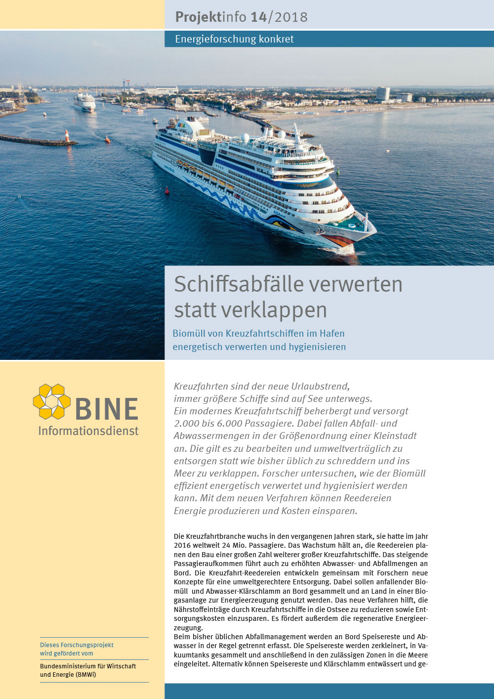 Die Kreuzfahrtbranche boomt, und weltweit gehen pro Jahr mehr als 24 Mio. Passagiere auf große Seereise. Jedes dieser Schiffe beherbergt und versorgt bis zu 6.000 Passagiere. Dabei fallen Abfallmengen wie in einer Kleinstadt an. Bisher wird der organische Teil des Mülls überwiegend in den zulässigen Zonen ins Meer eingeleitet. Das BINE-Projektinfo „Schiffsabfälle verwerten statt verklappen“ (14/2018) stellt ein neues Konzept vor, um den organischen Müll sowie den Klärschlamm an Bord zu sammeln und im Hafen energetisch zu verwerten. Modellregion ist dabei die Ostsee.